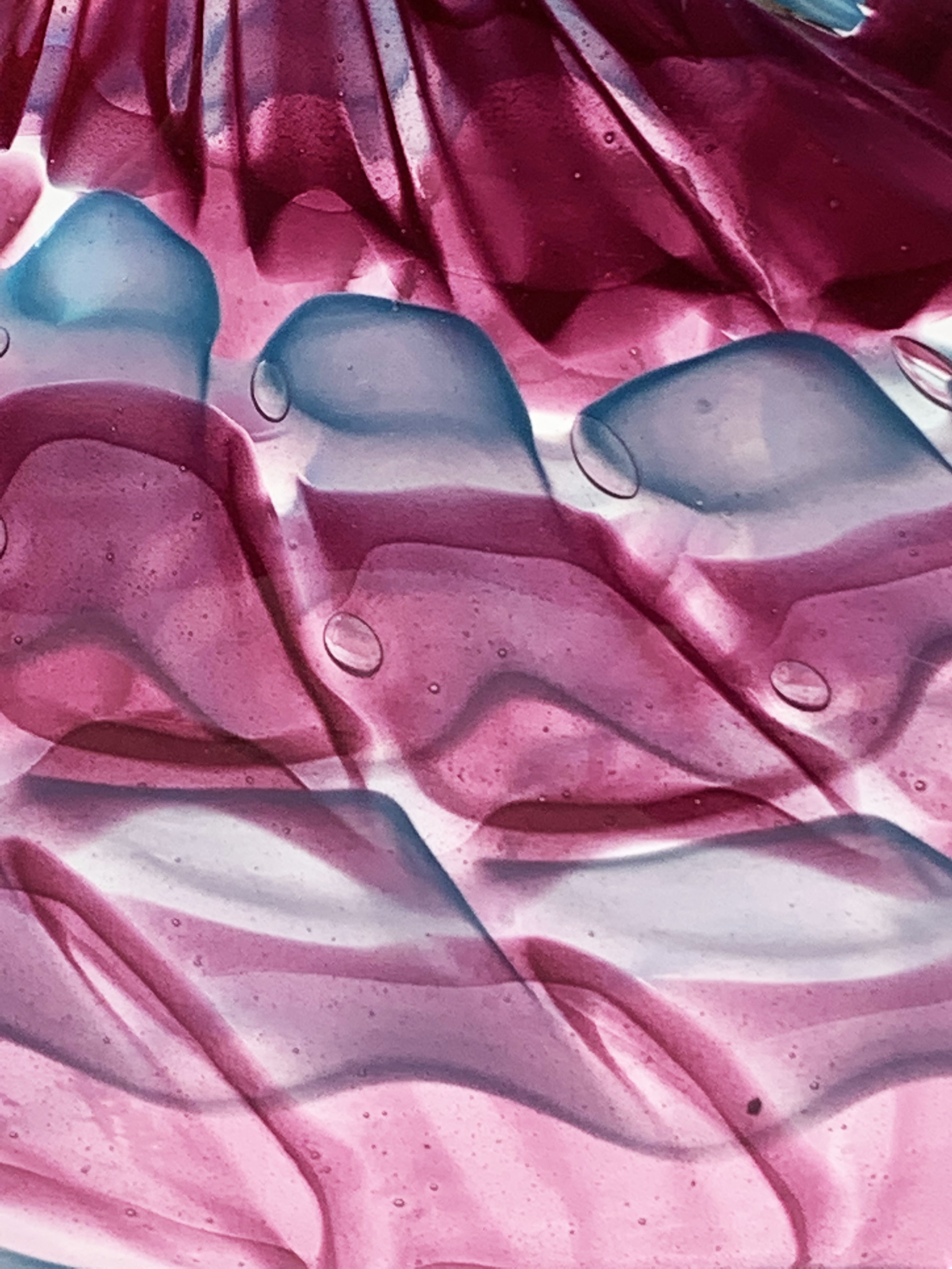 I am currently working on combining hot glass processes along with flat fused work to create large scale wall art, and intricately patterned blown vessels.