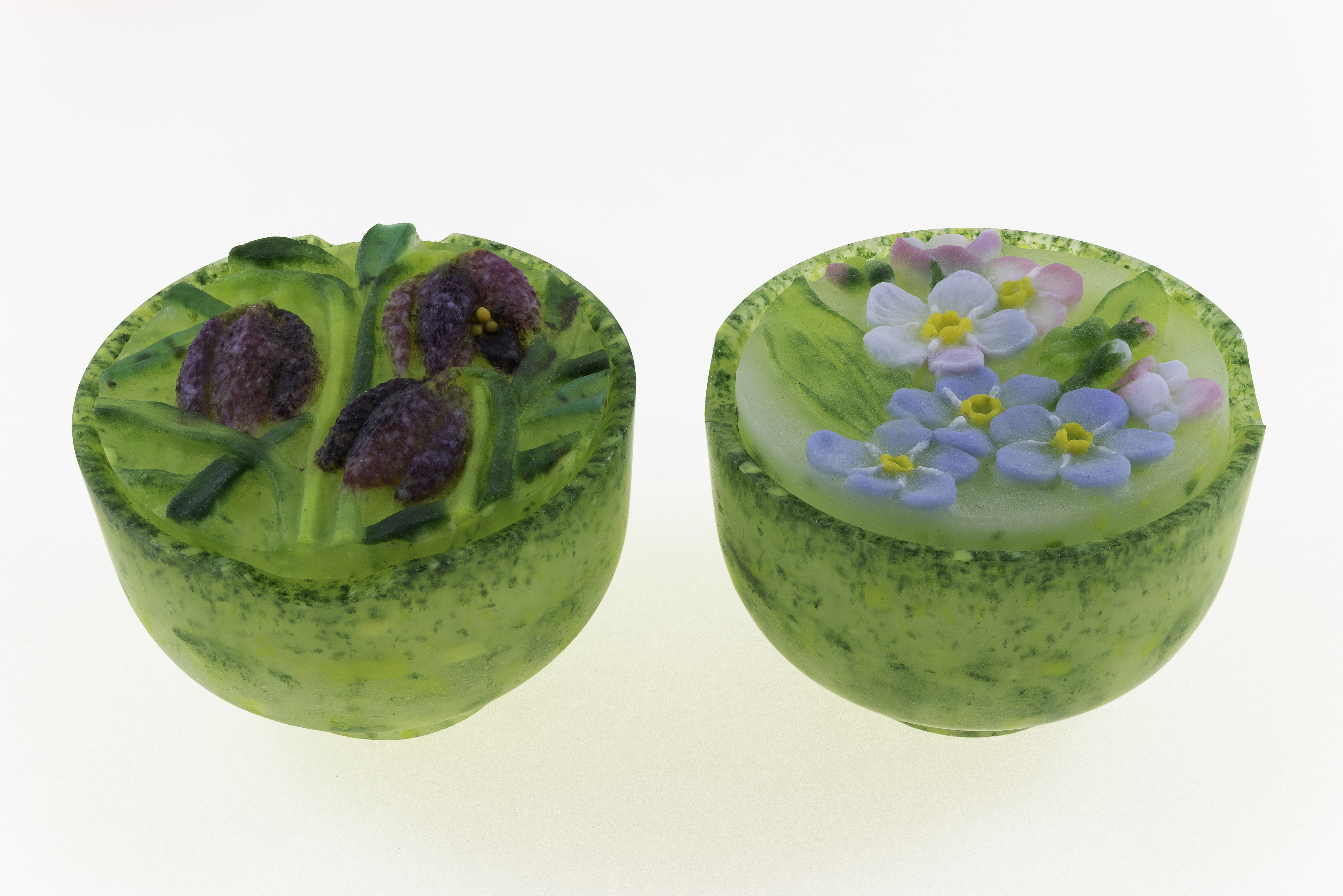 Small lidded boxes, fritillary and forget-me-not, pate de verre , Chris Jeffree