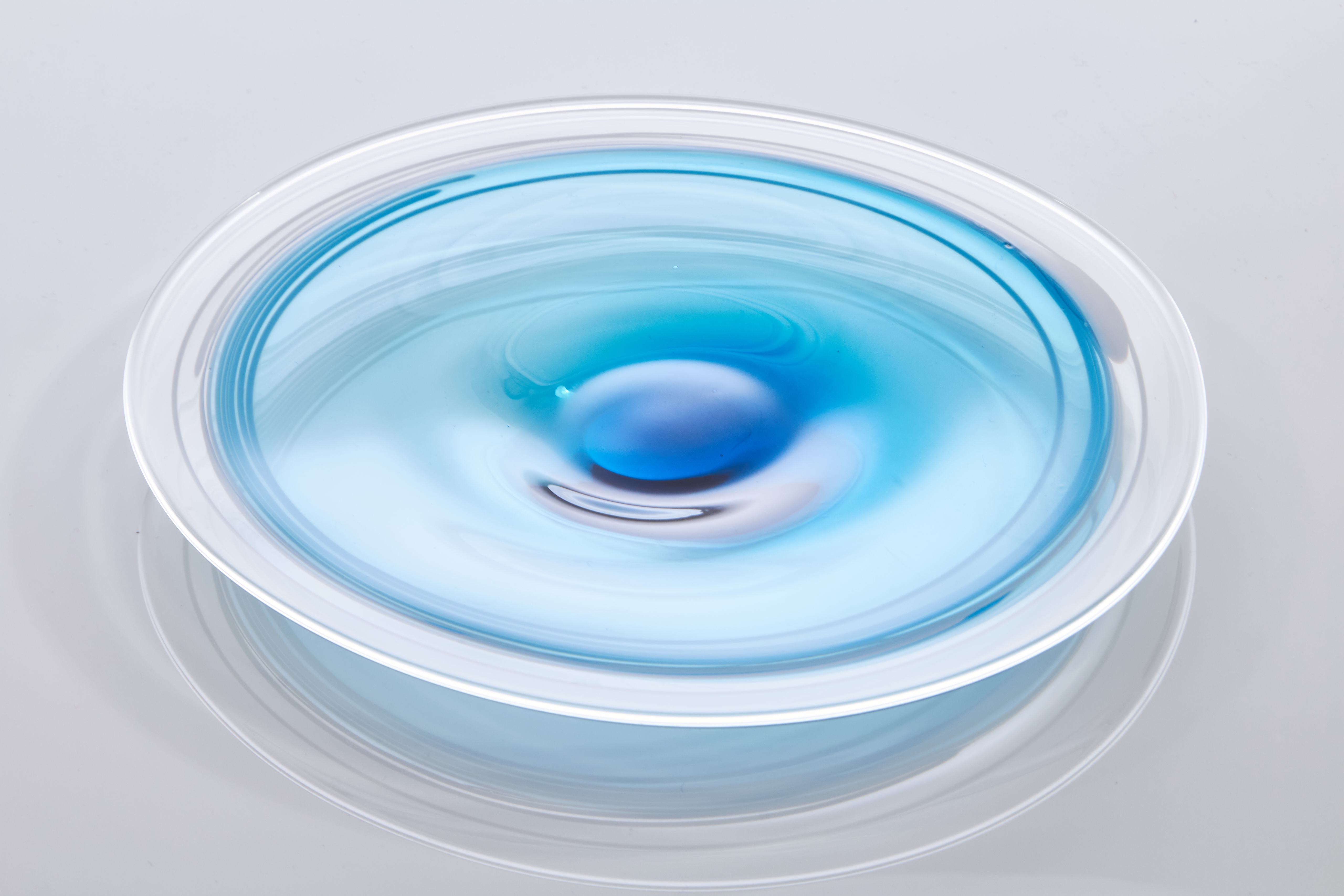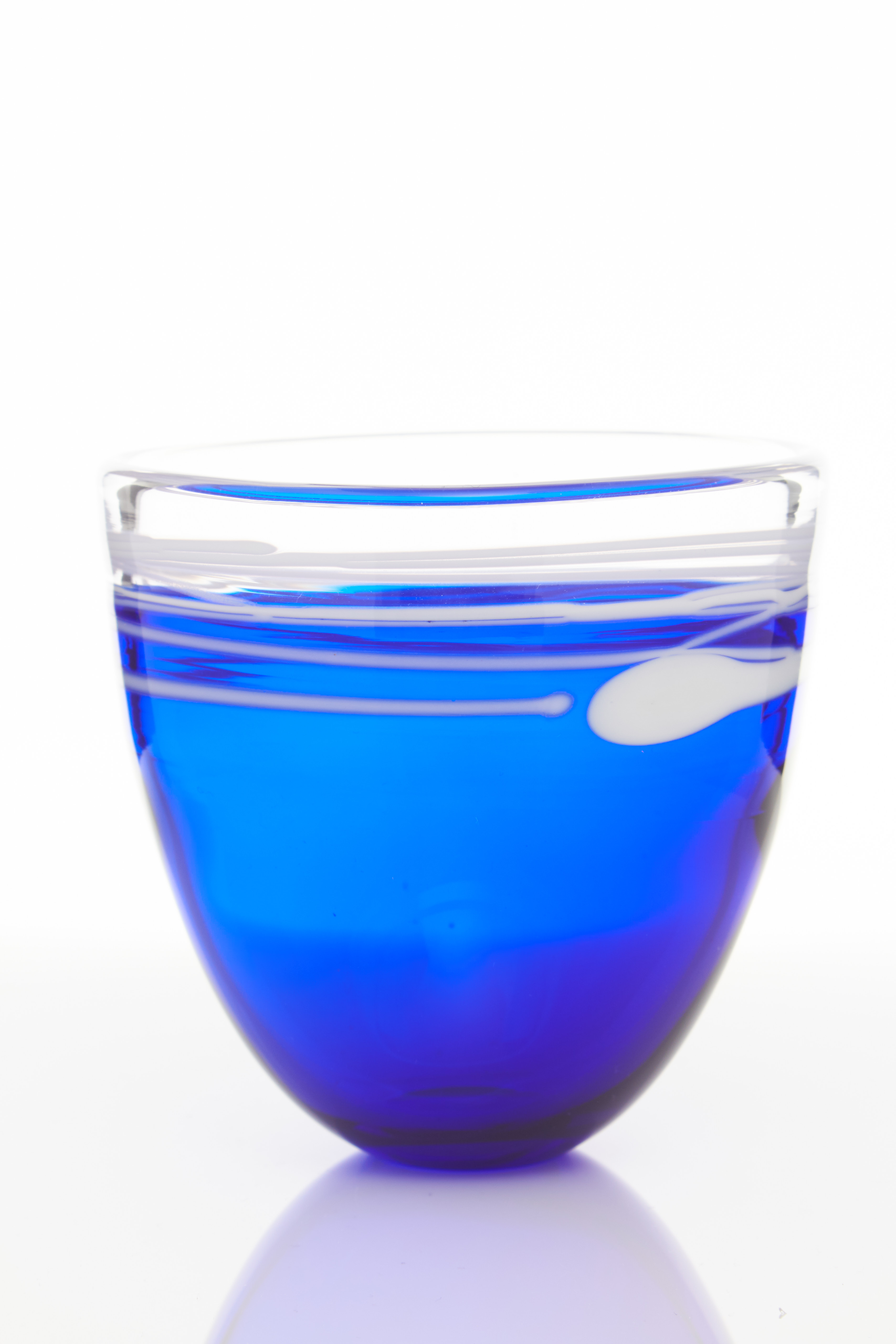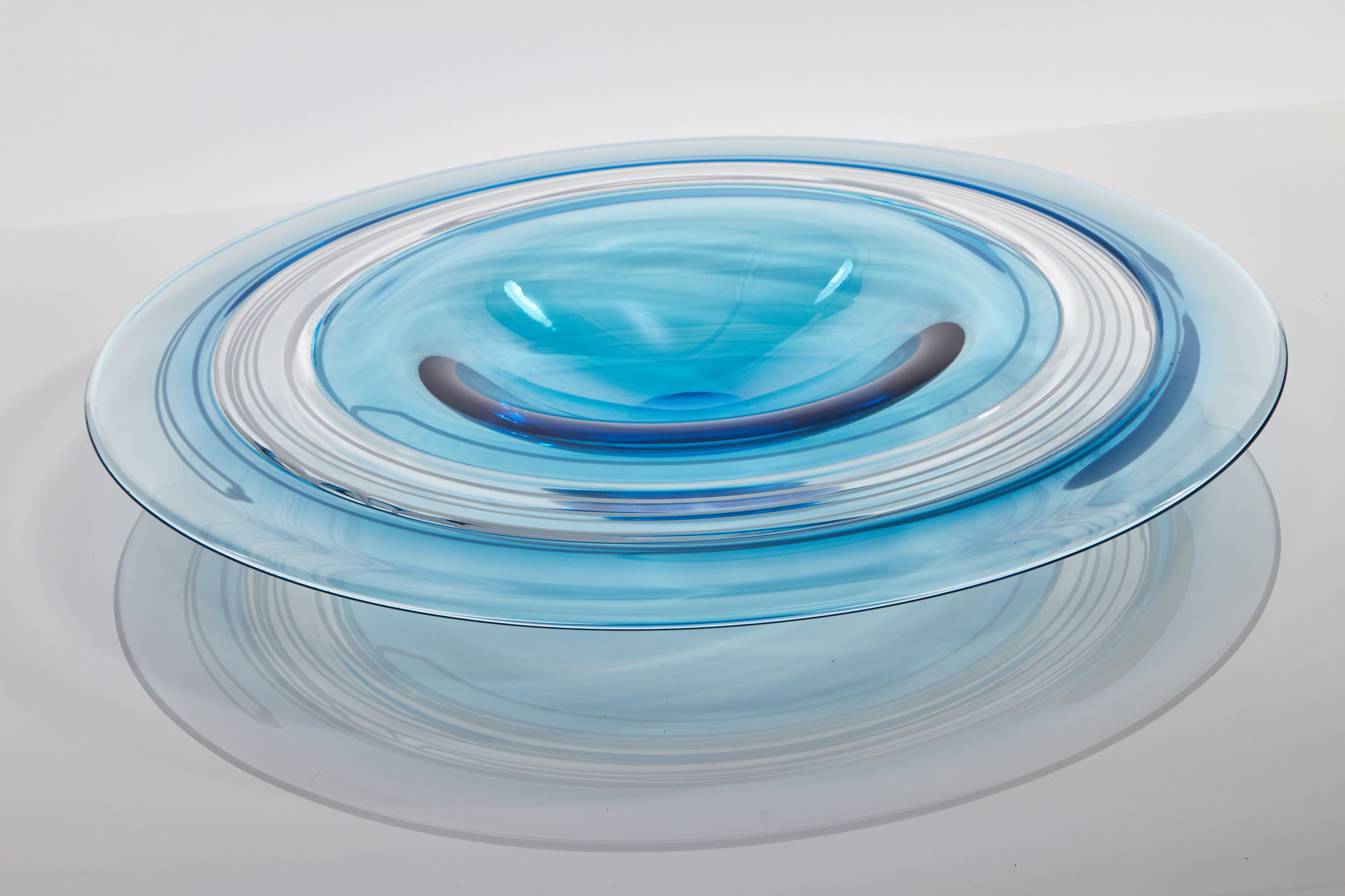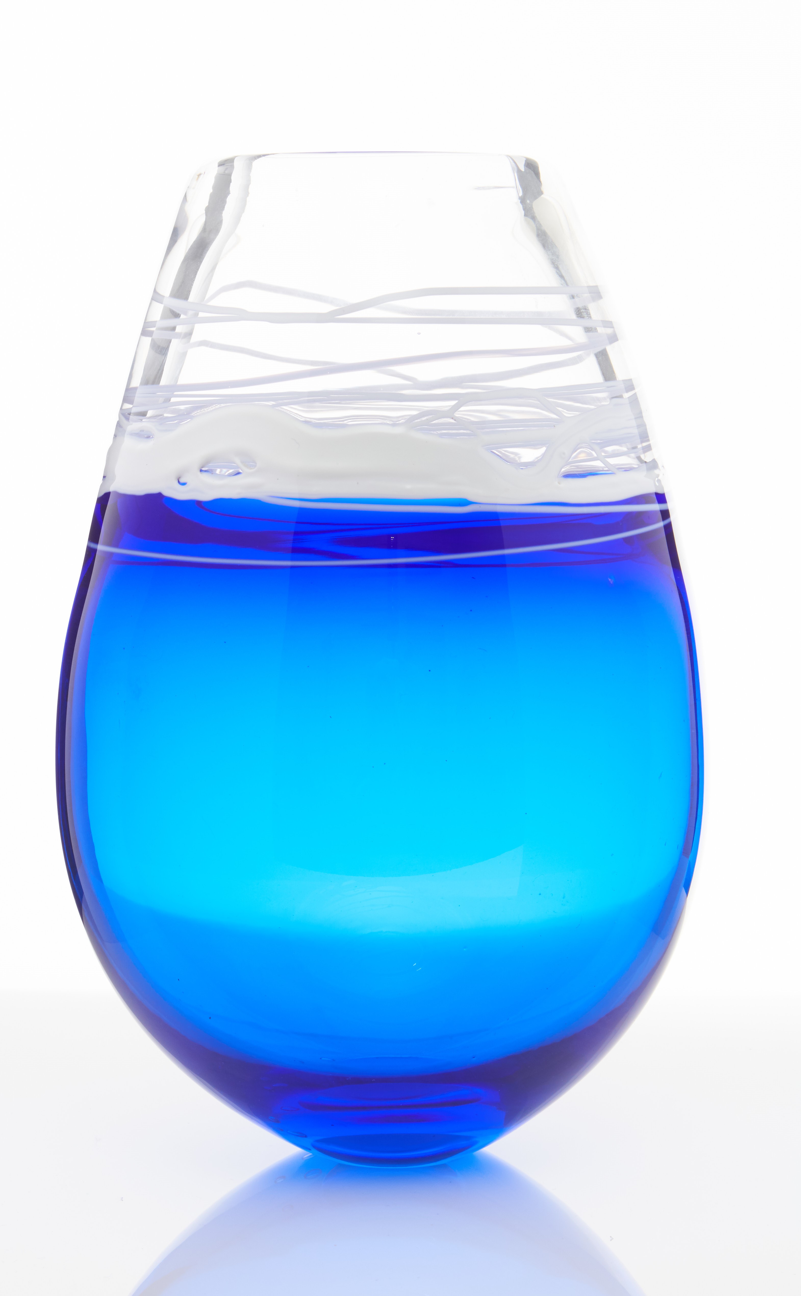 Crash: These designs originate from a fascination with the ocean and the powerful forces of nature. The waves rise, fall and crash as it reshapes the land to its will. She imagines these motions as she applies her design to the pieces. Drawn to the sea, with red flags that warn of danger, recreating the exhilaration of working with glass.