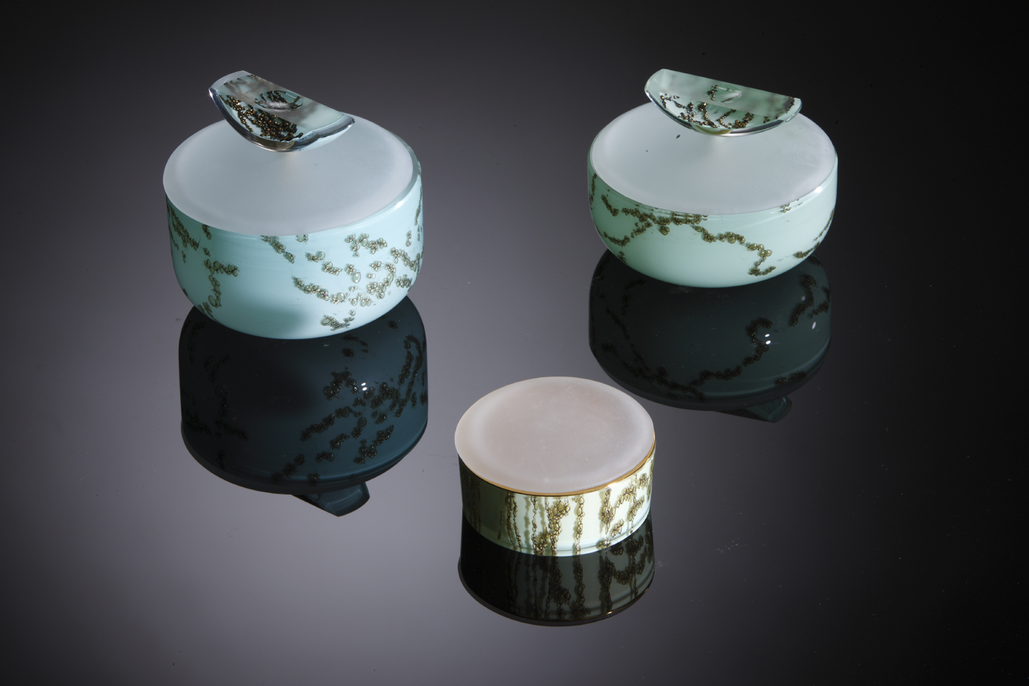 'Precious Integrations'series. 2011. Powder Puff Boxes and Trinket Box with integrated precious metal and glass jewellery. , Image credit Simon Bruntnell. Sara Fell 2011