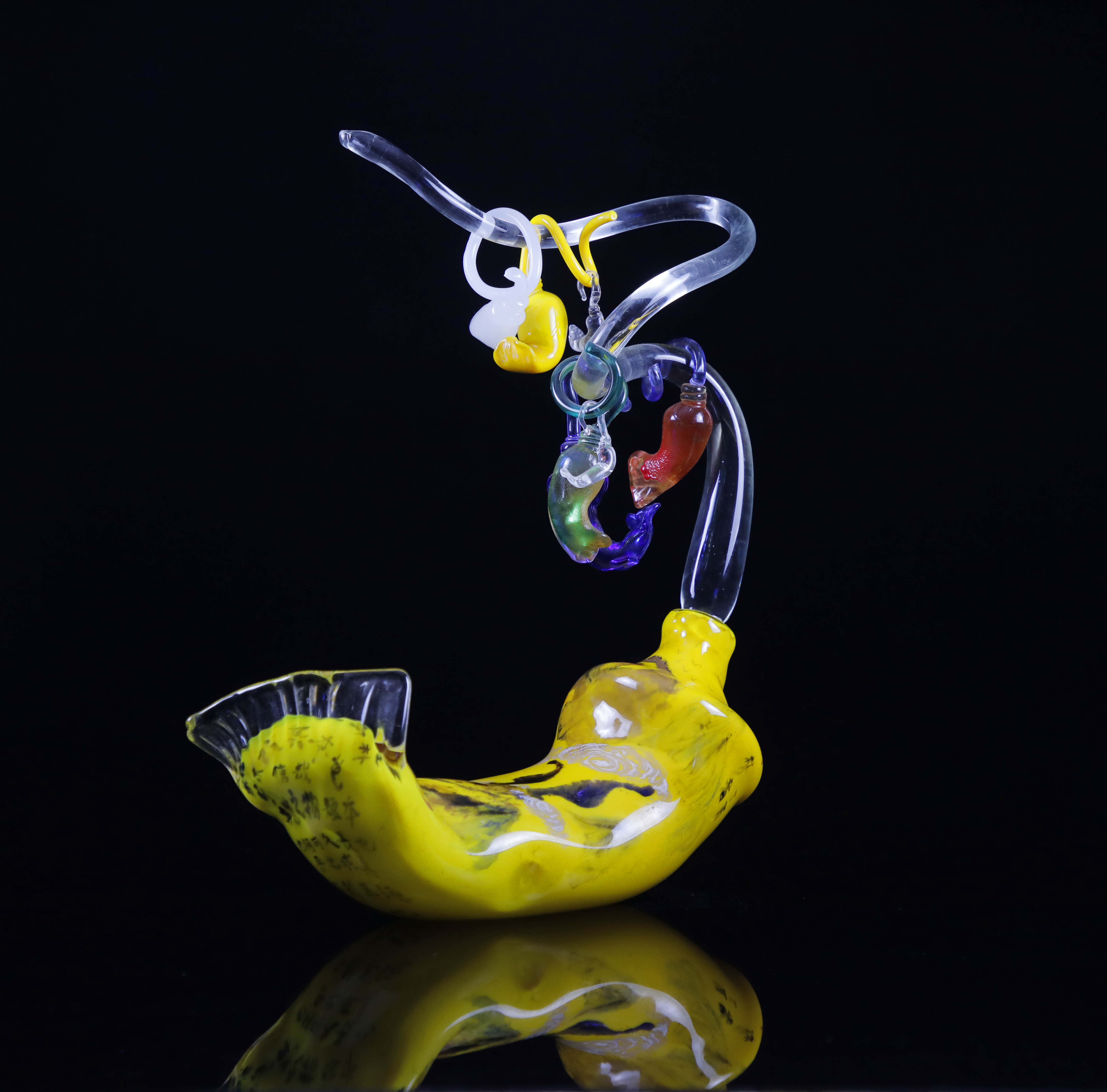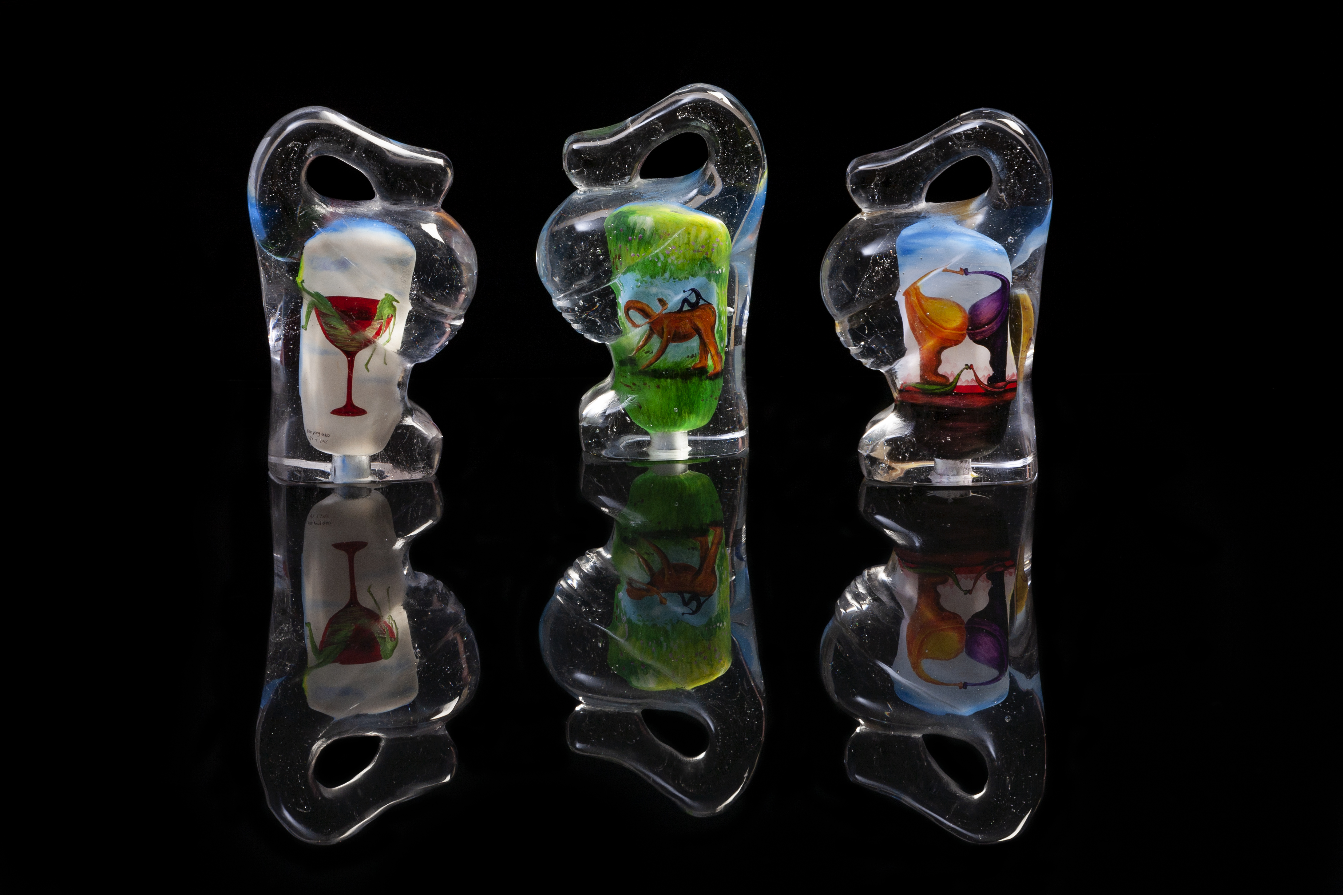 I apply casting, blowing methods in my glass works, my PhD focuses on the inside painting in contempoeary glass sculptures.