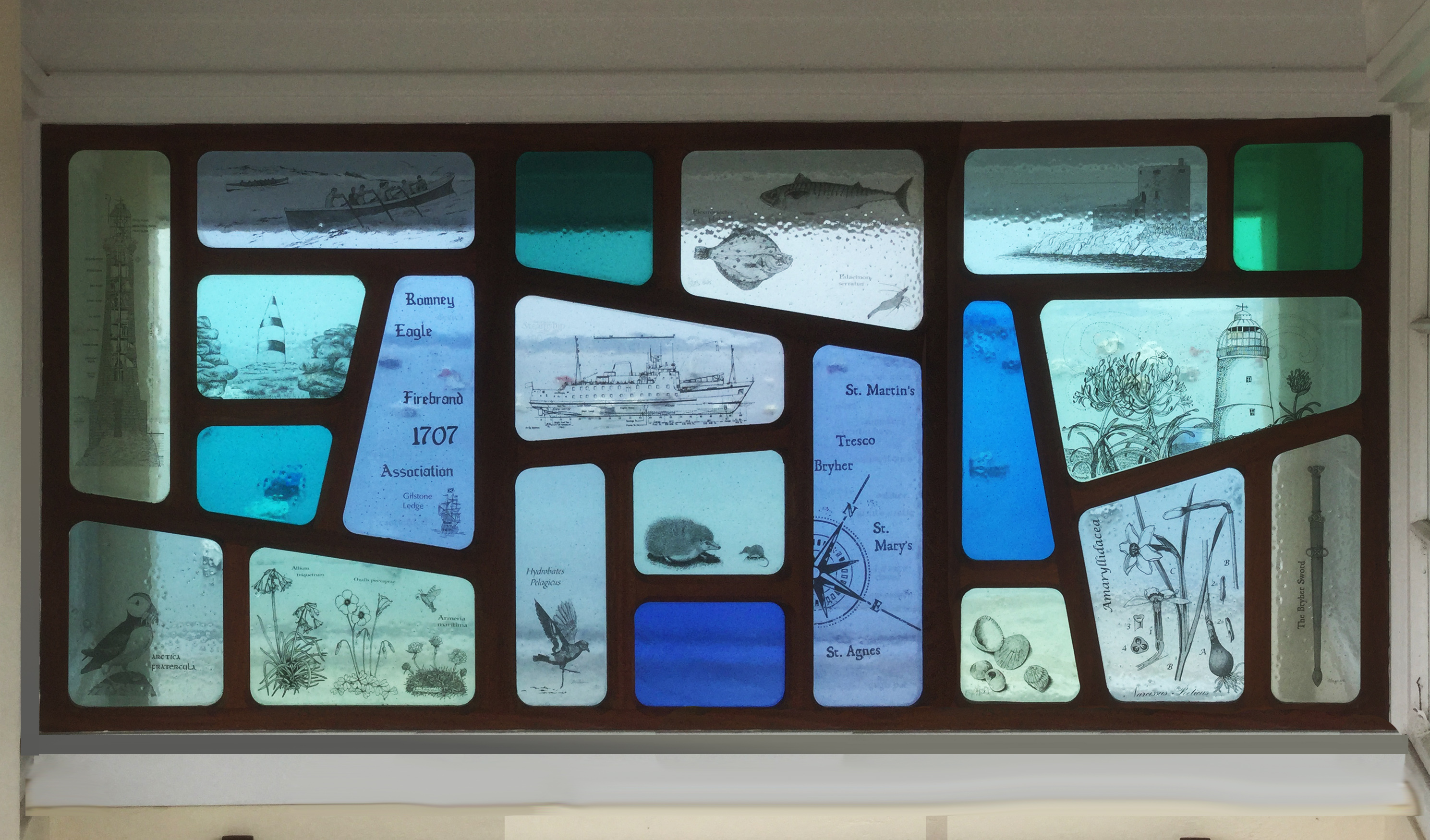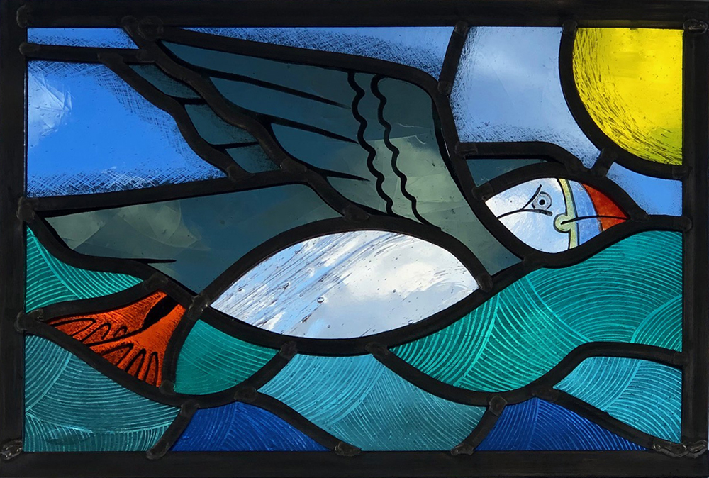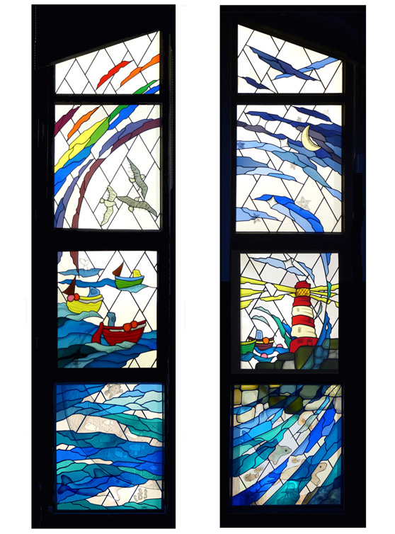 Most recent lead work was two windows in a Cornish church, next to three by William Morris… No pressure! I am presently involved with a community project beach shelter in Scilly, using tansfer- illustrated fused glass in sapele frame.