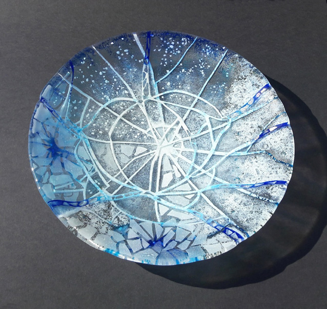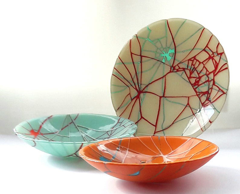 Recently I have become interested in how a work evolves after an initial dynamic intervention on the glass. Starting from this randomised ‘canvas’ I use glass fusing techniques allowing themes and ideas to coalesce and become the completed work. This approach enables me to produce unique decorative and functional items through to larger more considered artwork.