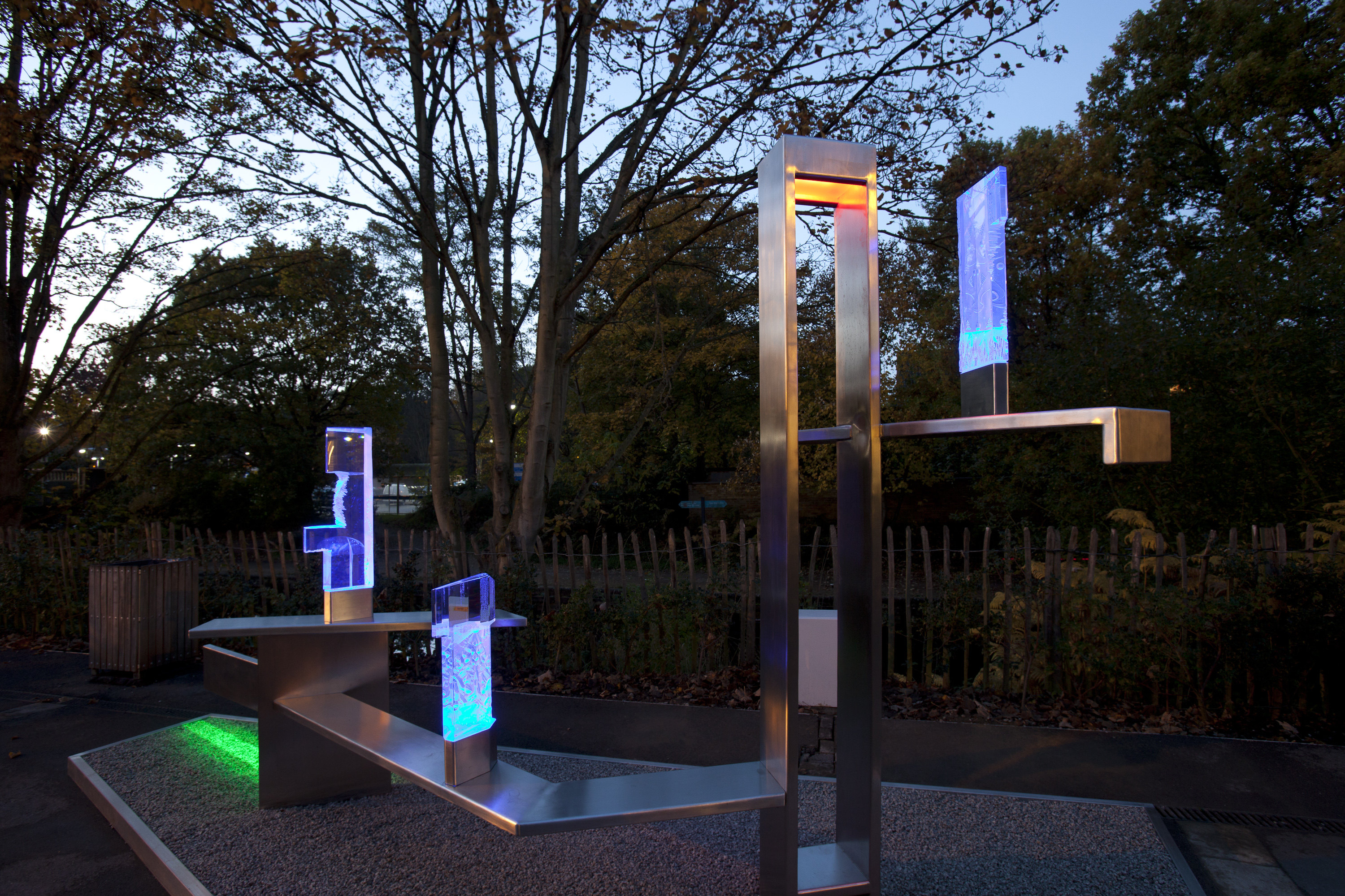 'Exchanging Luminance' Glass, stainless steel and choreographed light. Public art commission for The Lightbox Museum, Woking, UK. , Photo by Matthew Andrews