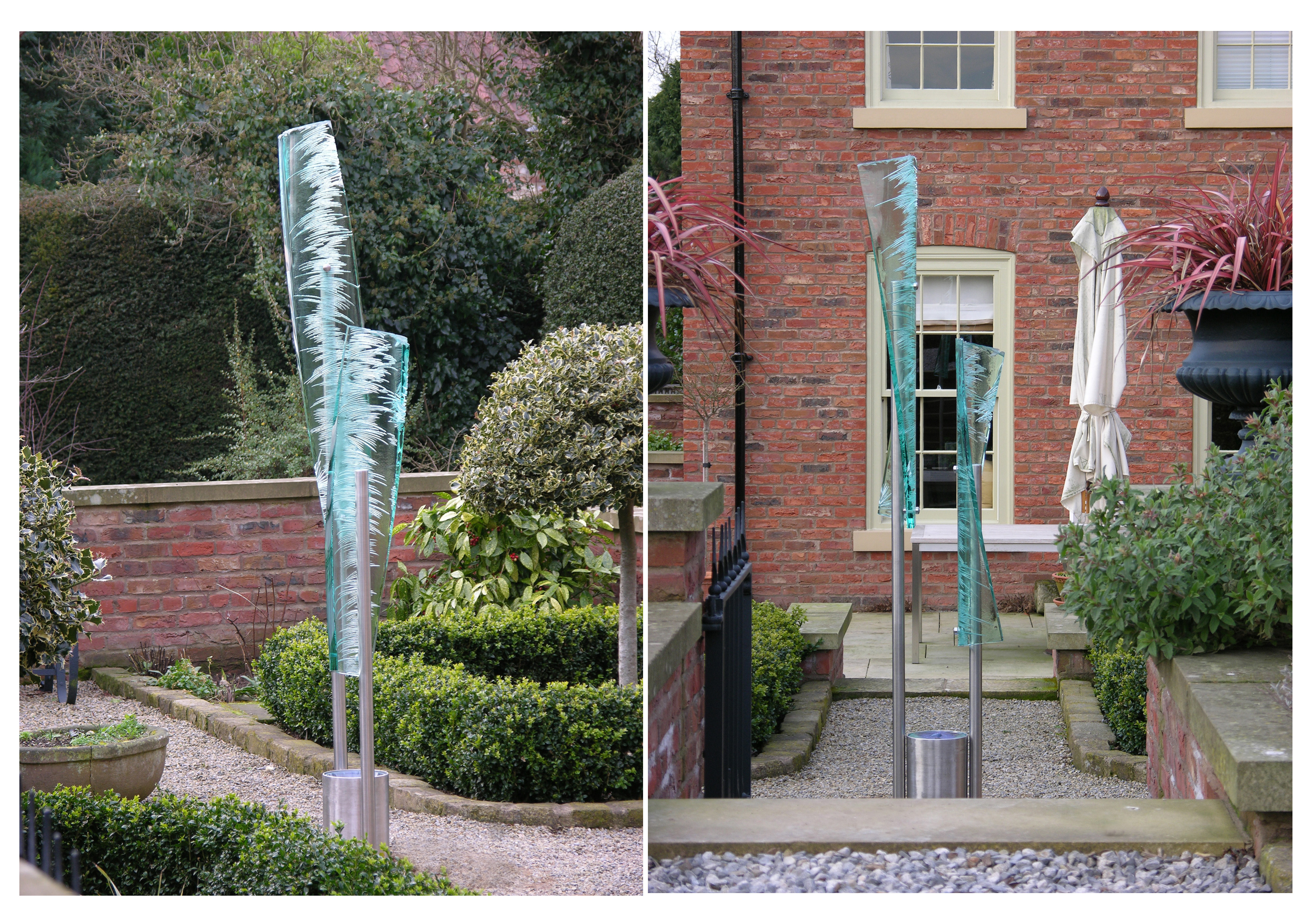 'Exchanged Glances II' glass, stainless steel, water and light. Commission for architectural practise. , Photo by Richard Jackson