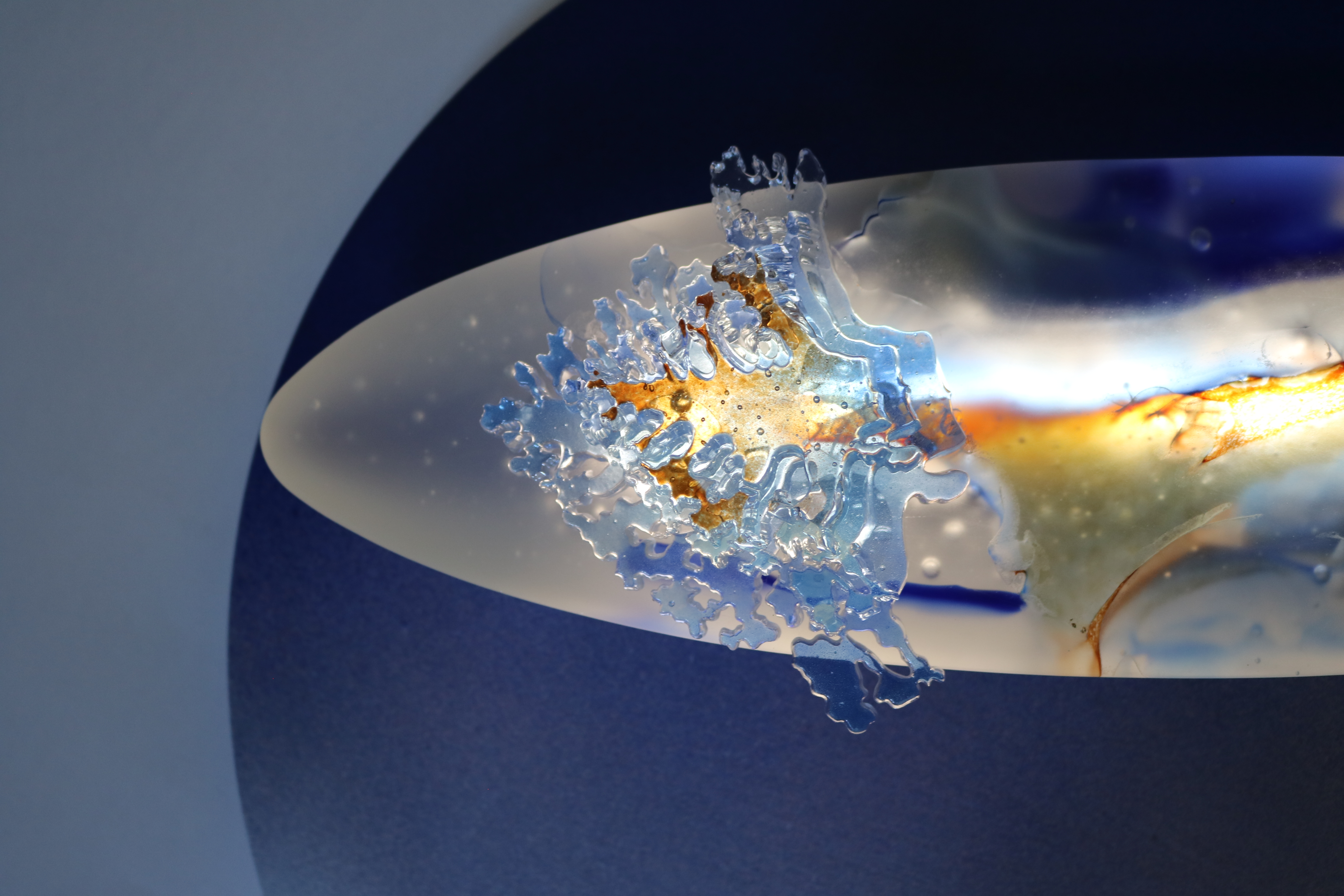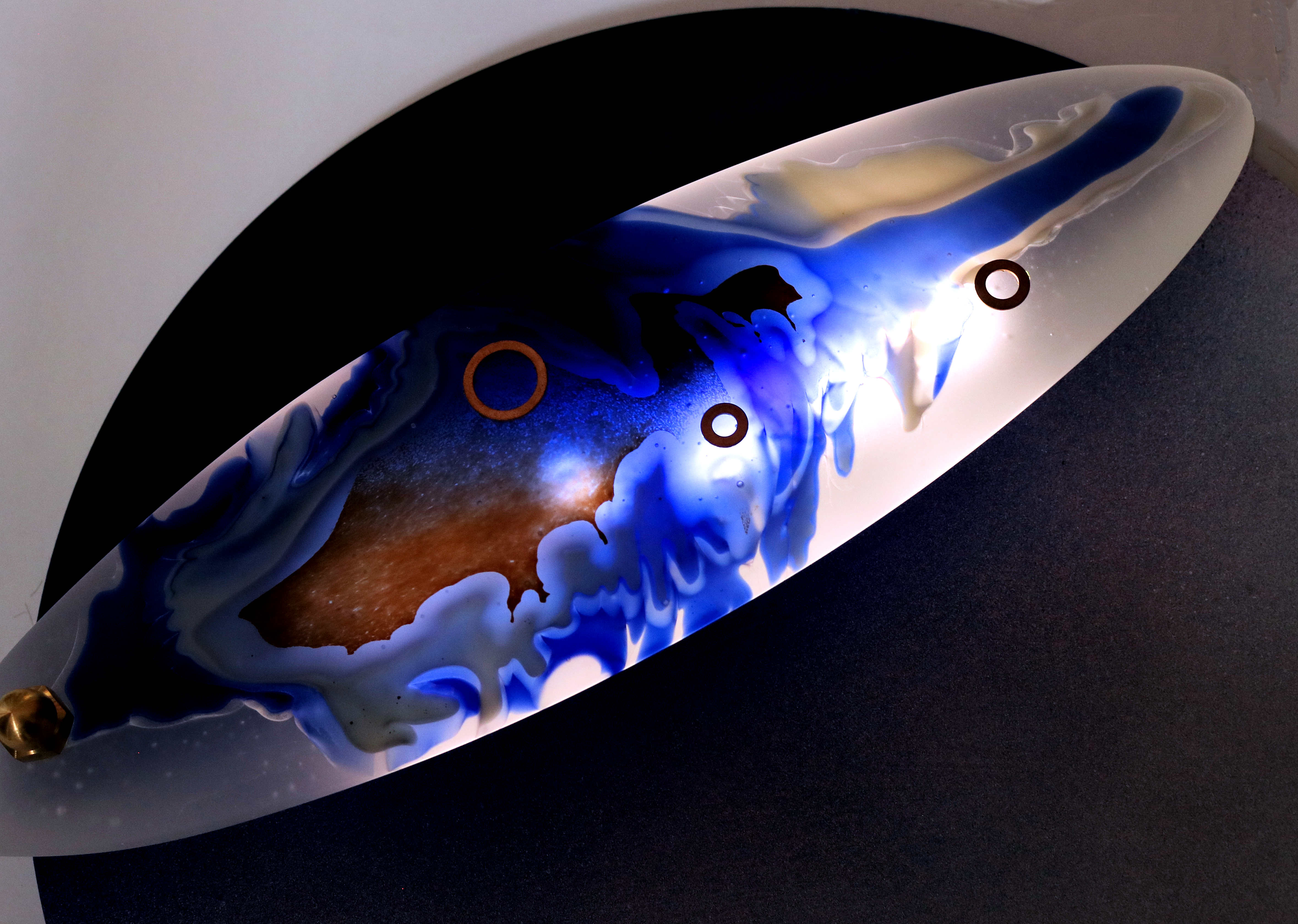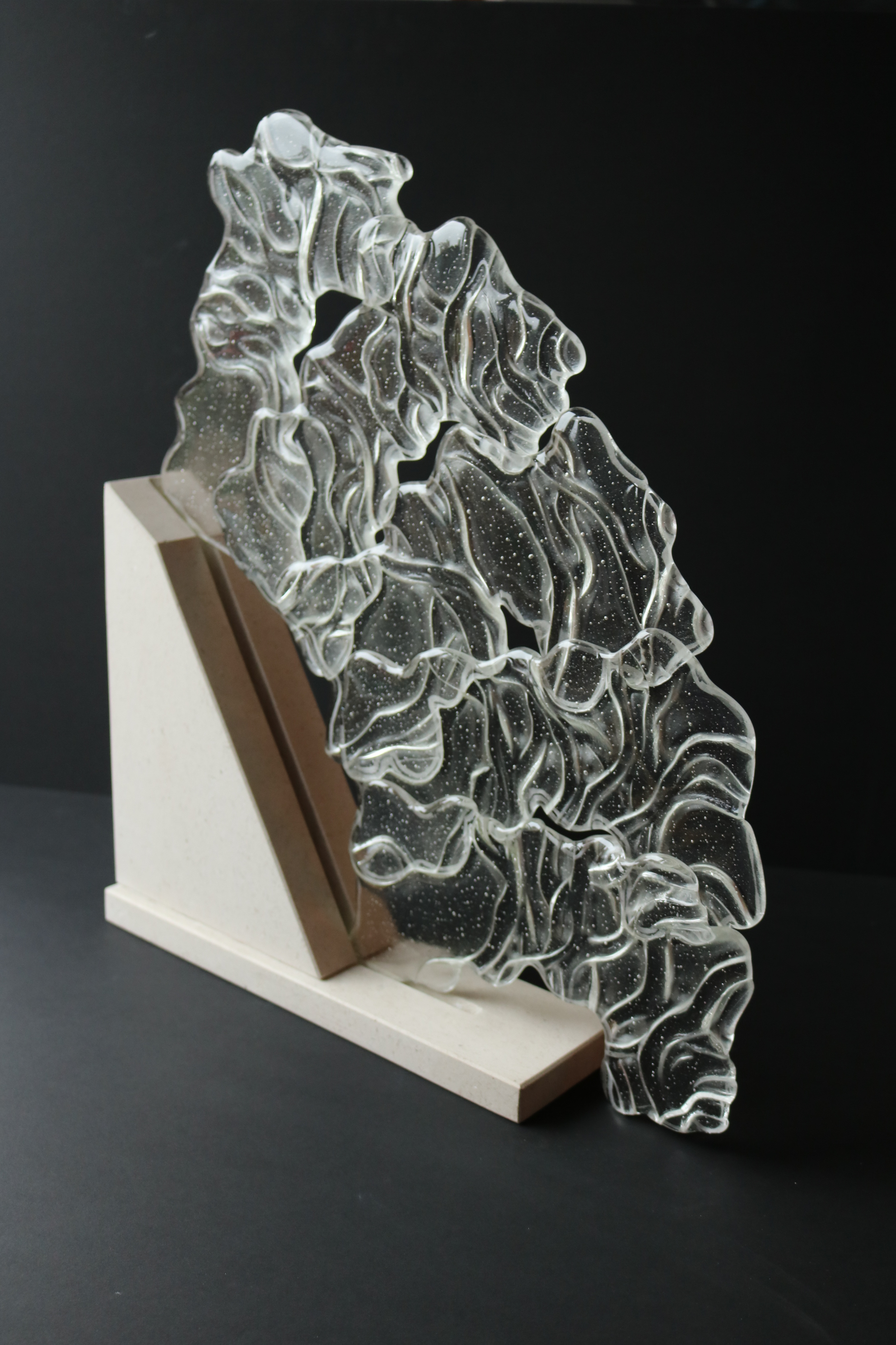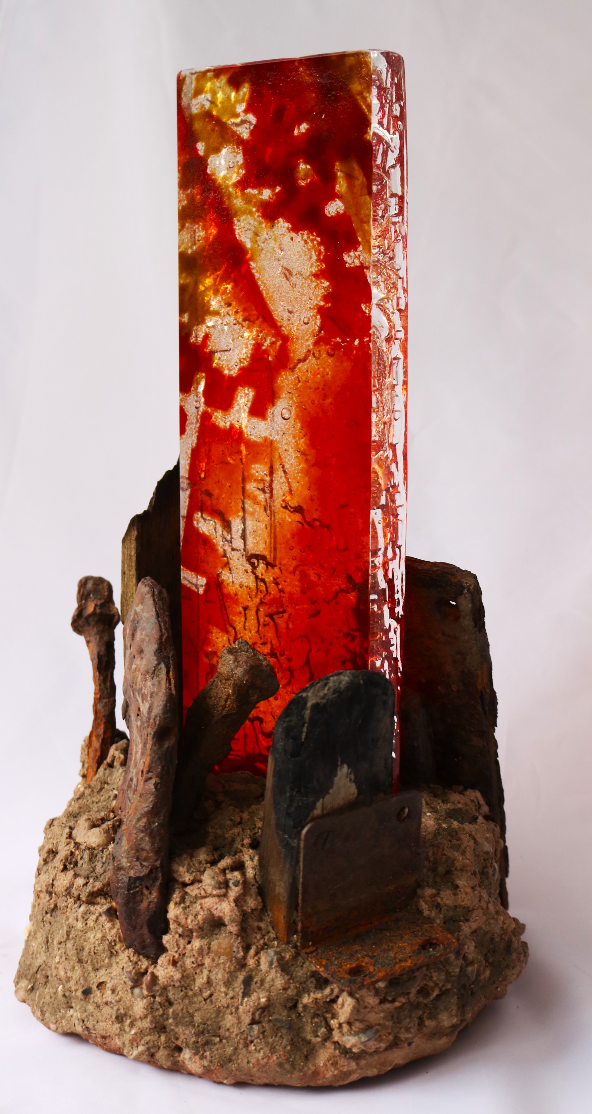 My main interest is in the mathematics and forms in nature and how the earth yields up its history through discarded objects and finds. Recently I have been exploring the theme of shipwrecks and the deterioration and loss of form through time. I have aimed to recycle all the scrap glass in my workshop to produce these sculptures which are now extending into adding glass to paintings which takes me back to my Fine Art roots.
