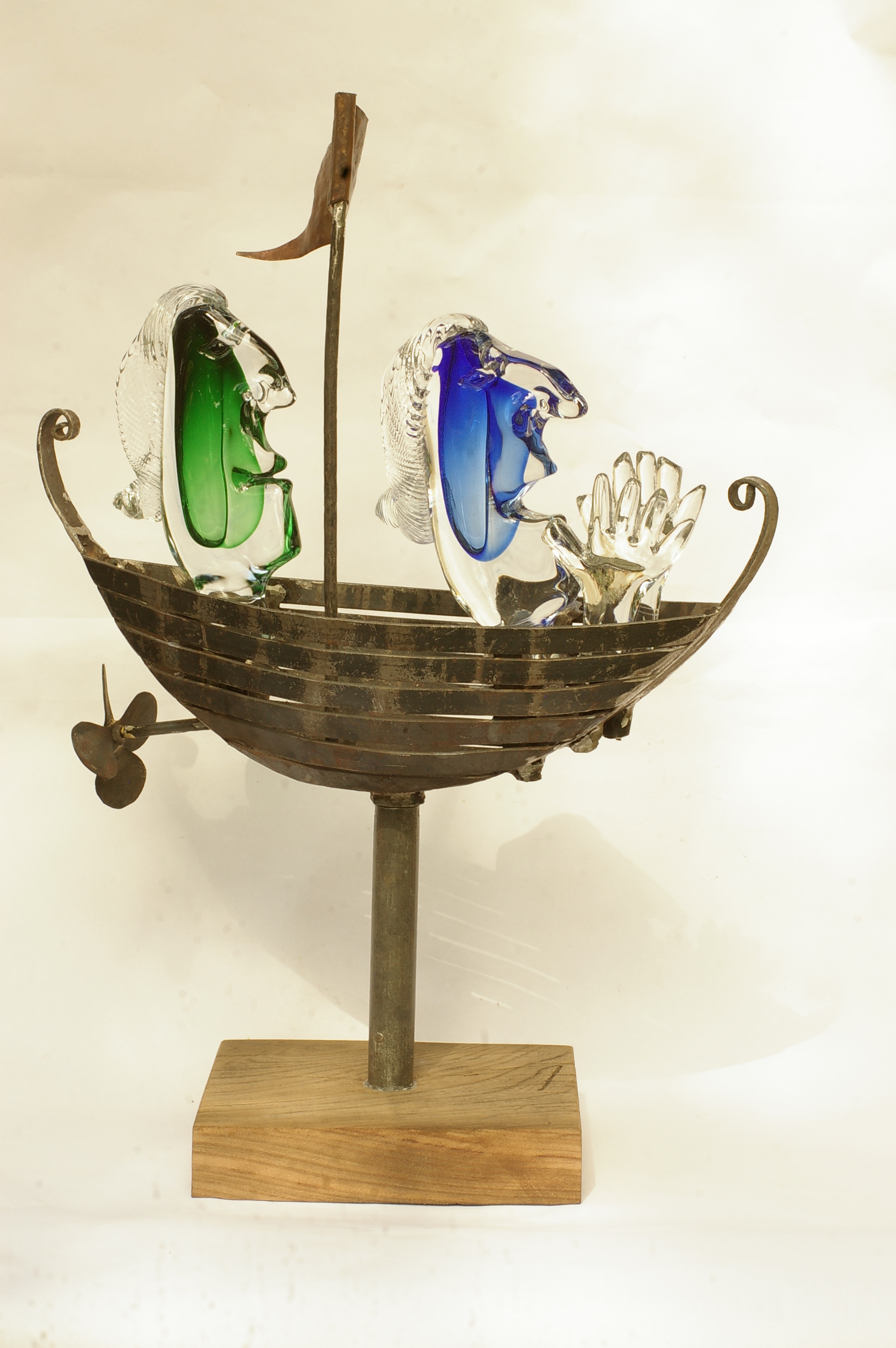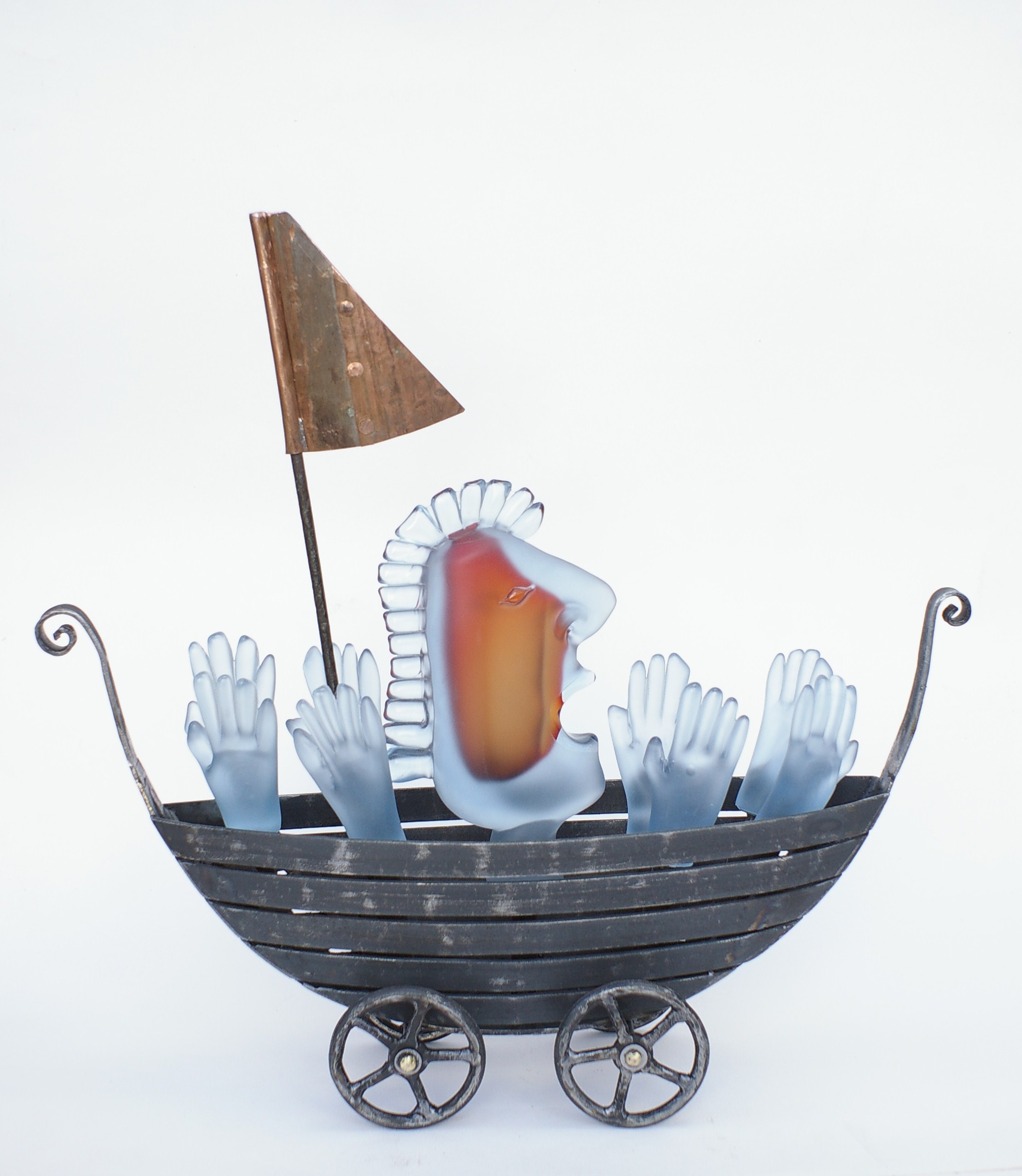 I now sell only through galleries and h/Art, a yearly open studio event where I demonstrate and sell. My current work is embarking glass heads in steel boats.