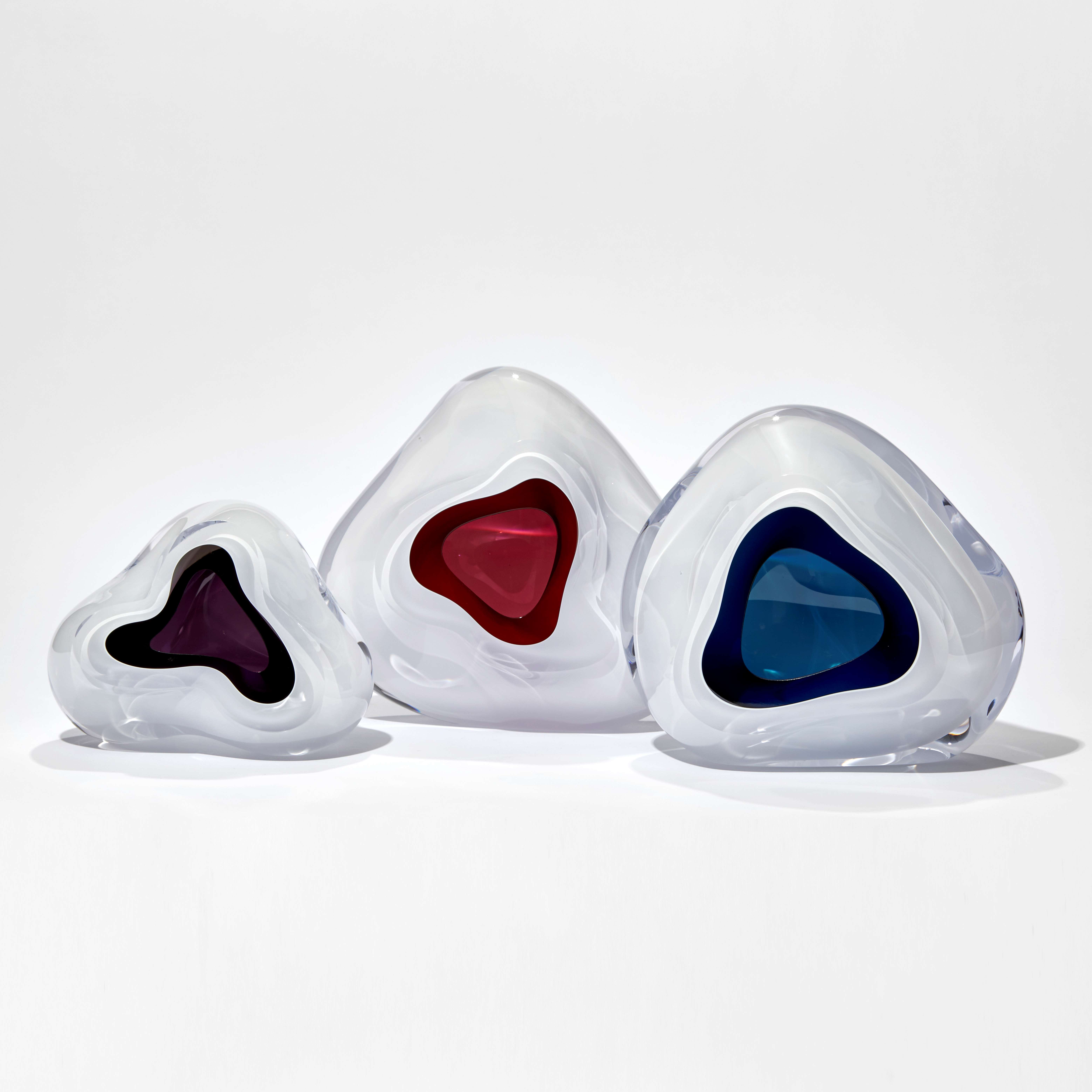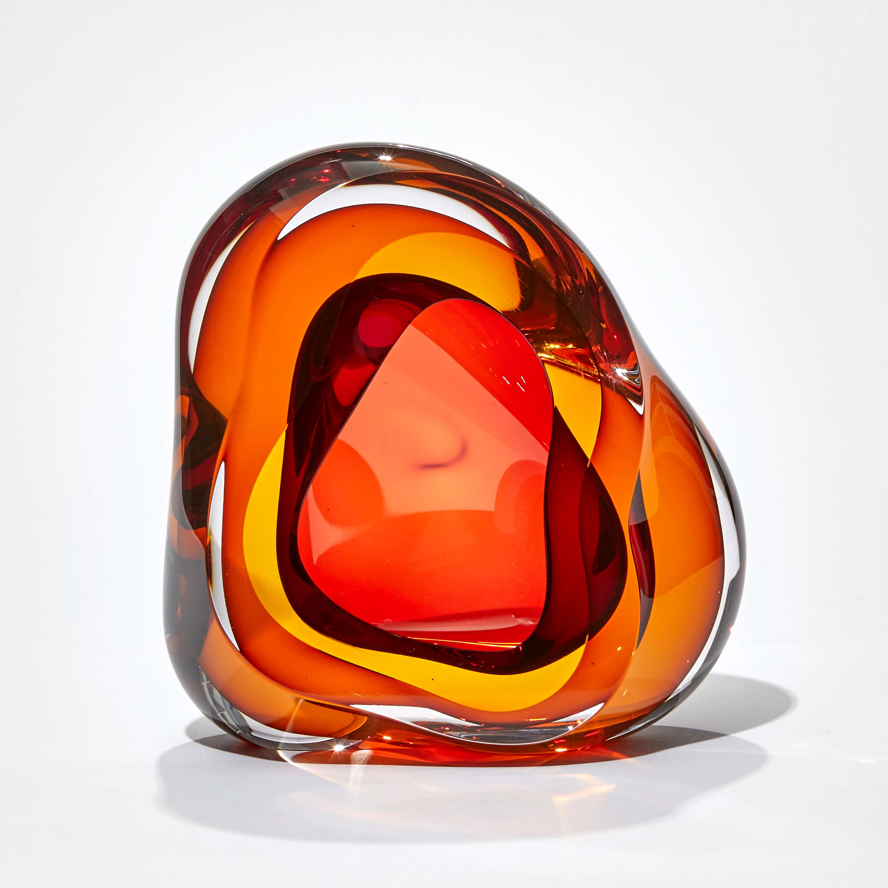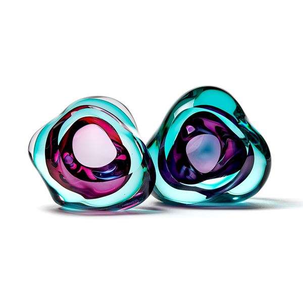 Samantha has always been fascinated by the ever changing perceptions between the viewer and a curiously unfamiliar object of desire. Studying minerals like agate forming under intense pressure and heat, Donaldson became intrigued by the way that such multi-layered and multi-coloured order forms out of such chaos. She soon discovered she could explore a similar thrill of slicing through rocks by using cutting and polishing techniques to transform blown glass forms, freezing a moment in time, creating stunning optical effects refracting light and movement. Initially inspired by geological layering and formations, Samantha overlaps transparent layers, blurring the lines between nature and fantasy. With a truly celebratory use of colour, these organic and futuristic, yet elegantly curious sculptures make depth seem limitless.