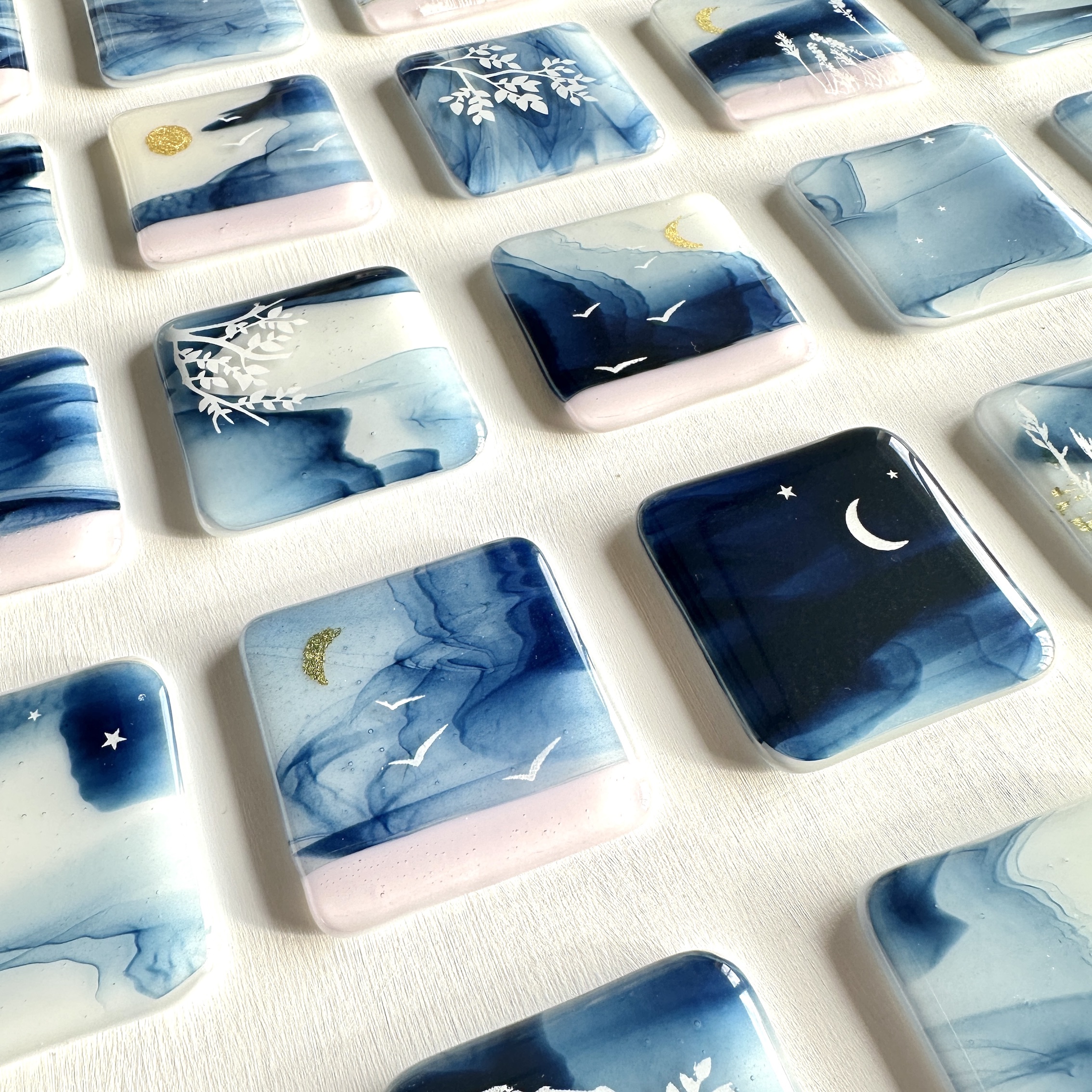 I combine my love of the sea and my passion for glass, making work that captures the essence of the coast. The glass work reflects the ever-changing energy and seasonal colours so you will discover both serene and vibrant work. I use a variety of materials and techniques to experiment with light and layers, often incorporating screen printed elements. I graduated with a 1st class degree in glass from Edinburgh College of Art, then received the Crafts Council Start Up Award to start The Red Brick Glass Studio in 2000. I love sharing my glass experience and skills, teaching monthly fused glass workshops from my glass studio in Lulworth Cove, on the Dorset coast.