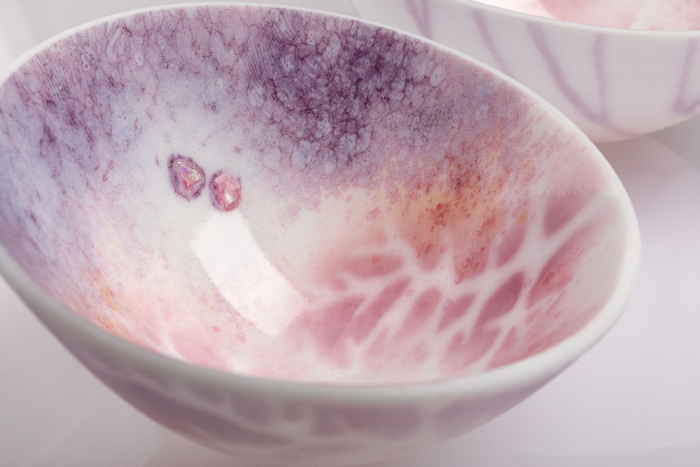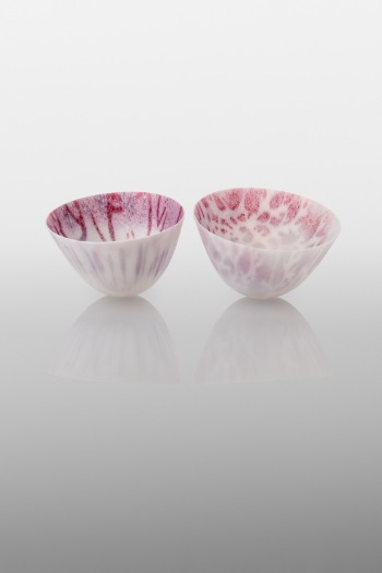 In my more recent work, developed since working on my Arts Council of Wales grant-funded project, ‘Gardens of the Mind’, I have learnt and developed new techniques. One of these involves working with gravity in the kiln to shape vessels with more fluidity and an organic feel. I went on a masterclass at The Glass Hub and spent time with Amanda Simmons at her studio to learn the techniques. Then I developed my own interpretation of the method. I have also found a way of working with glass powders to create intricate and delicate shapes, which is leading me to exciting places.