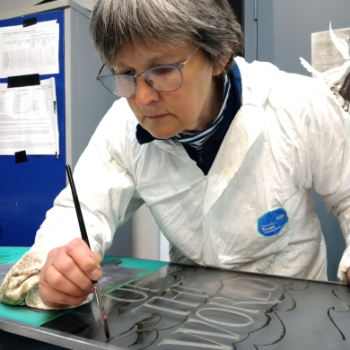 This piece was made for Holy Cross, Binstead. Here Tracey is painting embossing black resist prior to acid etching.