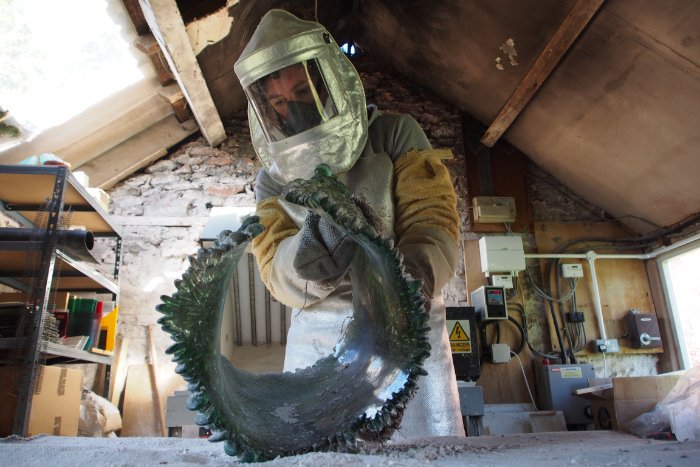 Then, when I get the hot cast glass out of the kiln to shape it, again it’s mostly done by instinct. I know that, if I did have a plan, I would be disappointed, because it is never exactly as I imagined. I also like the surprise of what it has turned into when I get it out of the annealer; it keeps it exciting. If I have too many guidelines, as with a commission, it never turns out very exciting at the end.