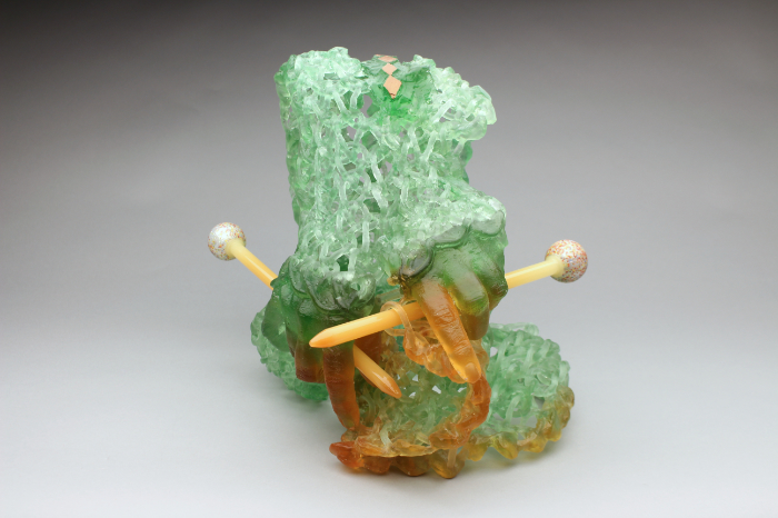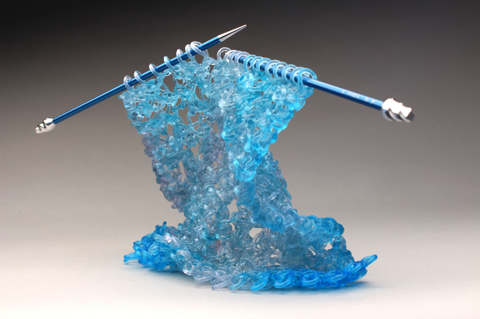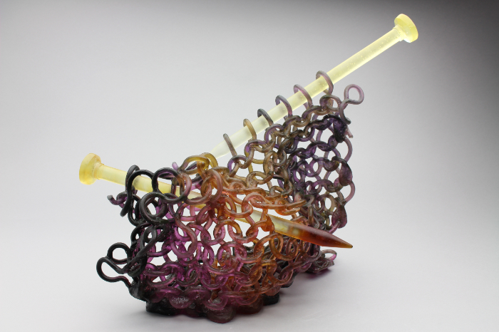 The major problem with cast glass is its WEIGHT. I have been a knitter since I was 10, and the sprue wax I was using for bronze casting reminded me of yarn. I wanted to knit with it, and cast it in glass – for the fun of it – with the added bonus that my cast glass sculpture could be lighter. It did take a lot of trial and error to get it to work, because glass doesn’t want to do what I want it to do.