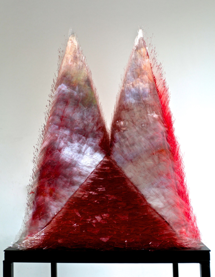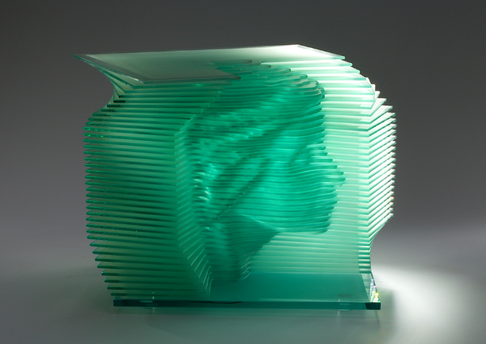 Cuban artist Carlos Marcoleta works in diverse fields, including glass. He layers custom-cut pieces of satin-finished float glass to form a structure, an inversion of positive and negative form, for example in the portrait of a woman who seems to be trying to free herself from inside the glass panes. Marcoleta’s work continually changes its appearance with the viewing angle, allowing the observer to explore ‘Mujer 2’ layer by layer.