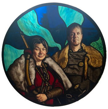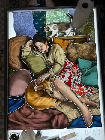 My creative process usually starts with a mental picture that I try to bring to life through photography, turning abstract ideas into something real. I often ask friends or family to pose for me. My ideas may be fuzzy initially, but they come to life during a photo session or a sketch. After that, I scale up the design and begin outlining the lead lines. I prefer using the computer program Glass Eye 2000, as it saves me a lot of time. When it comes to selecting glass, I try to use whatever I have in my inventory at that moment, even if it means thinking a bit outside the box. I try to spend as little time as possible on planning, although that approach can sometimes be a double-edged sword.