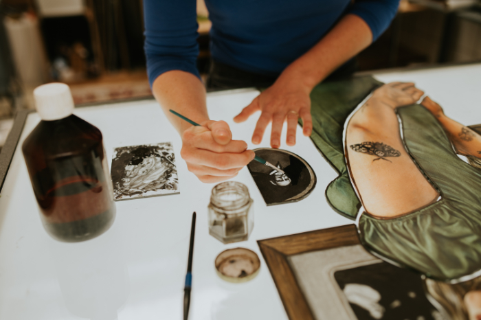 I’ve built up quite a collection of specific tools that I can’t do without now, and I love discovering new, sometimes unconventional, tools to use in my work. For instance, Christina Alvner, a talented glass artist from Sweden, introduced me to working with porcupine quills, which work perfectly for scratching into dry paint. Recently, I’ve also started using tattoo needles, especially the shading ones, which are great for crosshatching. Another tool I couldn’t do without is my tracing brush; it’s from the Da Vinci 5519 series and it’s my absolute favourite. Or my painter’s bridge, which was custom-made by my father.