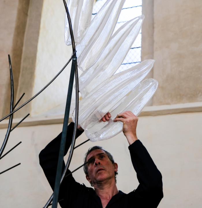 The sculpture is made up of over 100 glass ‘feathers’, each individually hot sculpted in clear glass with the introduction of fine white cane work, creating realism. The centres (rachis) are blown using opal white glass to create a hollow, so that each feather can be hung from the bones of the wings which are forged in iron. Each glass feather measures approx. 50cm x 6cm x 6cm.
