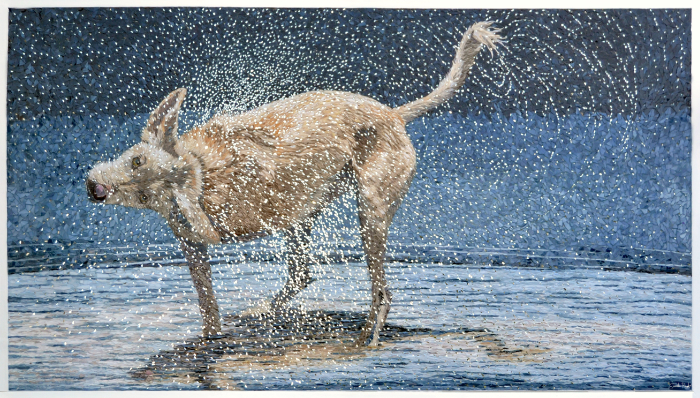 I guess one of my ‘favourites’ is a large (life size) artwork of my three-legged dog, Joey, shaking off water after swimming. I made this one about five years ago and, although there are many aspects I’d like to change about it, every time I walk past it catches my eye with the water sparkles and I find myself smiling at ‘Joey’. I only own three of my own mosaic artworks (two of which were my first ones), so I guess that it must be a favourite as I haven’t sold it!