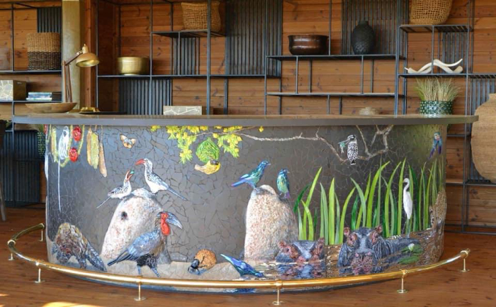 One of the many highlights was designing and creating a large bar for a private game lodge (Tuludi) in Botswana. I worked on different sections of this mural in my studio, before they were crated and trucked up to the lodge. I then went on site to complete and grout the mosaic work. This mural was definitely challenging (especially working on the curve with inflexible glass!), but it was such a fun and rewarding project. And it was pretty special to work with elephants watching!