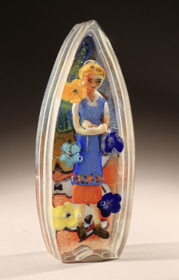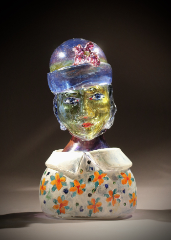 I have recently begun to work with large blown figures that I paint with low-fire paint, and then reassemble hot. I like to experiment with different ways to use hand painting in glass art.