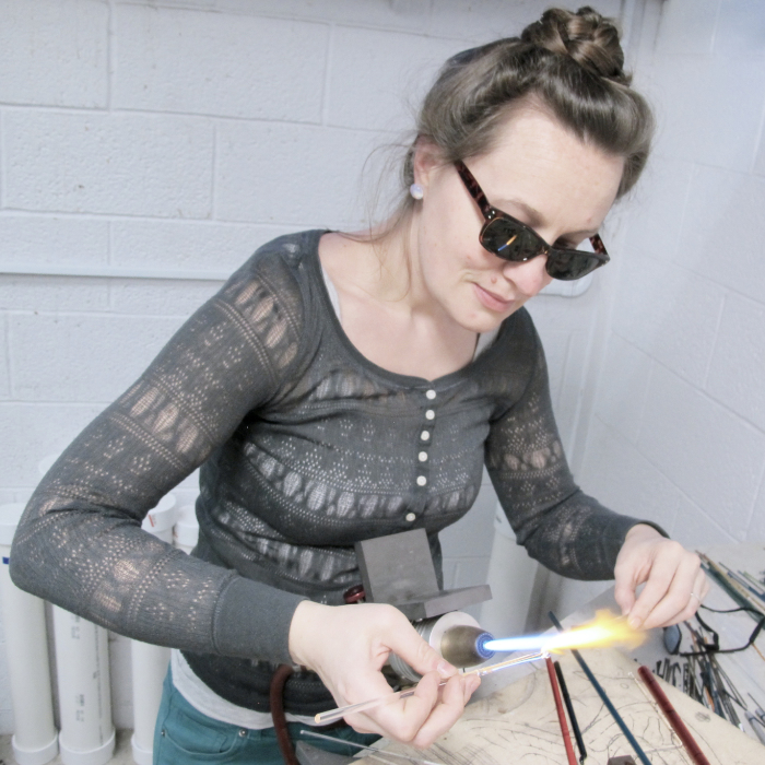There are a lot of great things about flameworking. It’s fairly simple and easy to set up a flameworking studio (particularly in comparison to setting up a hot shop, which is the area of glass I started in) and one can work alone and independently. It appeals to my innate love of small things, but flameworking can also be a good way to make large things out of small, modular parts. Borosilicate glass (the type that I use) is particularly good for this. I like the level of detail I can get with flameworking and how delicate I can make things.