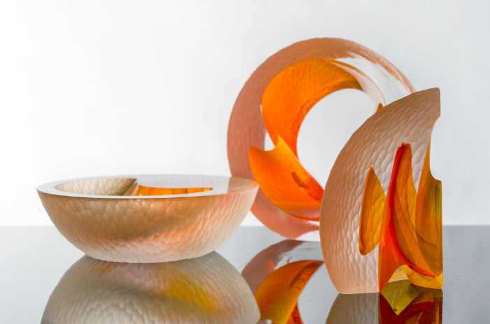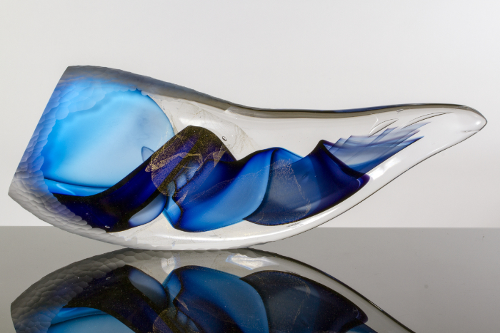 When I have an idea or theme that I want to explore, I think deeply about it to come up with a starting point. The piece is made in the hot shop, and then sculpted with cold working to the most appropriate form that demonstrates my theme. Cold working depends on the individual piece and seeking out where the colours and interior forms of the glass look amazing.