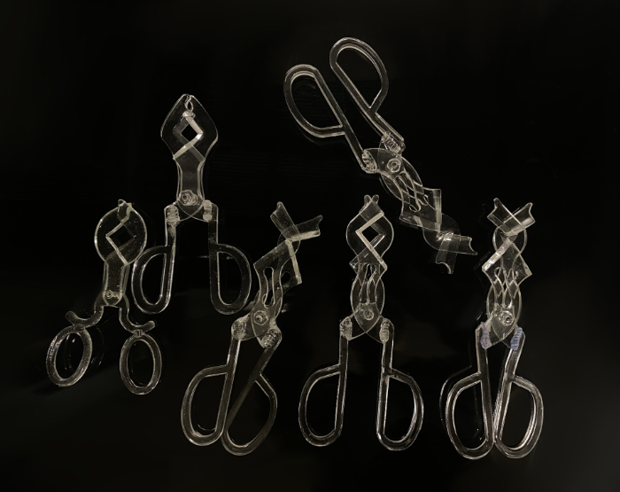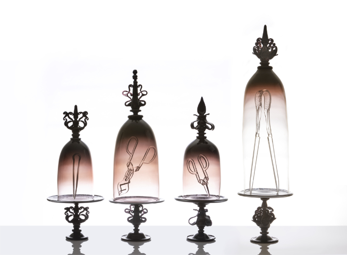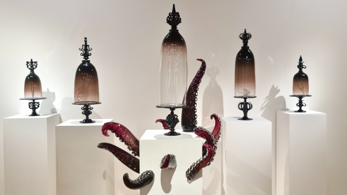 My favourite piece is my BA degree show installation, titled, ‘Please Don’t Doubt Your Faith (The Holy Relics)’. This work serves as a meta-reference to glassmaking while subtly expressing internal doubt. It features a complete set of basic glassblowing tools crafted as relics. I chose to work primarily in black, to convey formality, mystery and an aura of evil, with a gradient from black to fuchsia for the tentacles. The tentacles represent inner struggles and crawl on the plinth with different gestures, symbolising attempts to steal or sabotage the ‘holy relics’. This artwork reflects the journey of self-doubt experienced by artists, yet it also resonates with viewers who have battled their own dark thoughts and emerged stronger.