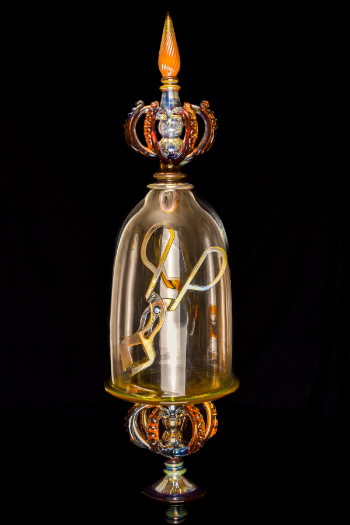 The artwork ‘Refined relic’ has a humble yet captivating presence, with a single artefact enveloped in many metallic hues. It had to be created with care as it underwent the brutality of the glassblowing process. It levitates with an unnatural aura within a transparent dome, giving the feeling of being held by a divine force or entity. The piece exudes a bold sense of opulence, symbolising not only the artist’s dedication to the craft and how much it means on a personal level, but also the journey to find balance with the expectation to achieve a gold standard in each piece of work we artists make on a regular basis.