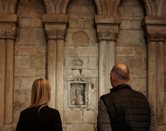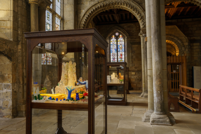 Monster Chetwynd’s dioramas of Bede and St Cuthbert on display inside the Galilee Chapel at Durham Cathedral. Photo: David Wood.
