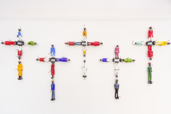Pascale Marthine Tayou presents ‘Colonial Ghost’, which invites the viewer to consider connections between colonisation and the growth of Christianity in African countries. The artwork consists of 32 Christian crosses, each made using five human figures. The nails adjacent to each figure are important to the work, echoing Christ’s crucifixion.