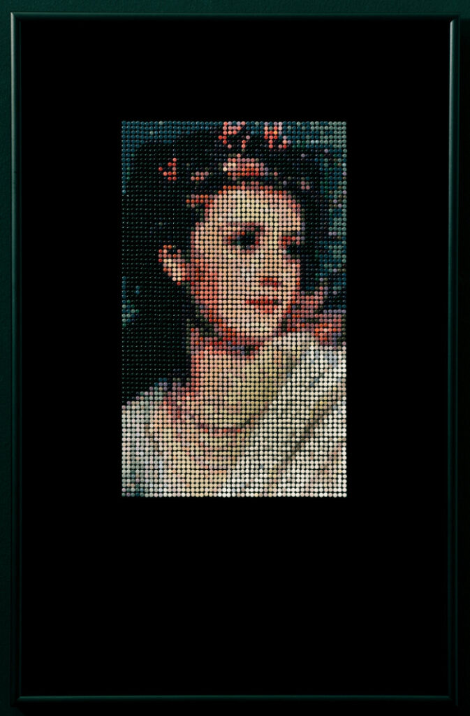 Just as plein air painters find inspiration in a specific landscape they wish to interpret, I tend to find intrigue within a particular artistic genre. One year it was focusing on the details of Pre-Raphaelite portraits that served to inspire; another year it was illustrations of women from the early 20th century. Once fully engaged I dive into learning everything possible about a specific period and aesthetic. I study the details of what was found to be compelling for that era and explore what makes it timeless today. Then I set out to illuminate such classics in a new format and way of seeing the images, through a mosaic of glass dots.