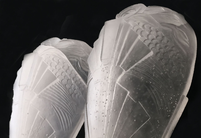 It must be kiln cast lead-crystal glass. It is such a versatile process that can bring very intricate and ornate concepts into reality. We have had some amazing cast glass commissions in the past few years – custom wall lights, decorative inlaid marquetry panels, floor-to-ceiling decorative glazing, and cast architectural mouldings, like skirting boards, dado rails, sconces, and even entire fireplaces!