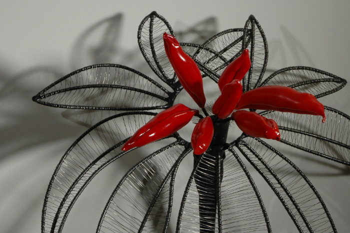 Botanicals and flowers have long been a source of inspiration for adorning the body in a jewellery format. I have been exploring this idea on a larger scale and refer to this new series as ‘Wall Brooches’. Holding the light, the glass contrasts with the airiness of the wire form, playing on the idea of reversing the density of steel and the translucency of glass. The shadow cast by the wire form also speaks of transparency and the movement of light, while the glass holds the colour and brilliance of the blossom in the moment.