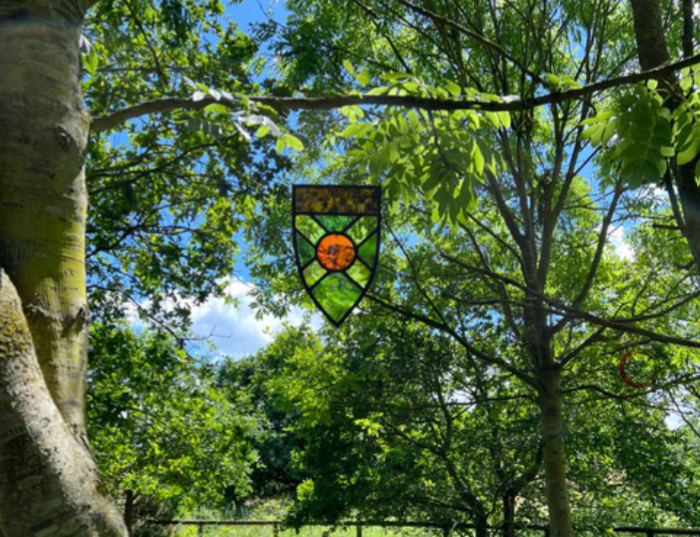 “As an artist, I feel frustrated at the lip service paid by politicians in power to make the urgent and brave changes needed to reduce climate warming. Stained glass, being an environmental art, can be enjoyed on so many different levels and has been a powerful medium of communication for centuries. Employed here in the grove, the glass shields and circles make defensive connections with the trees and ecological cycles as the earth spins and orbits the sun.”
