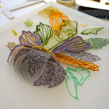 It is hard to choose just one tool, because the process has many different steps. Every step has its own tool and way of working. But I guess the most helpful one in printmaking and in the final assembly is duct tape. It is versatile and I use it a lot for many things. I also have long tweezers, which I use a lot to handle the hot pate de verre pieces when the kiln is still hot. I make rapid exchanges to save time, electricity and heat. I also use the tweezers for the assembly.