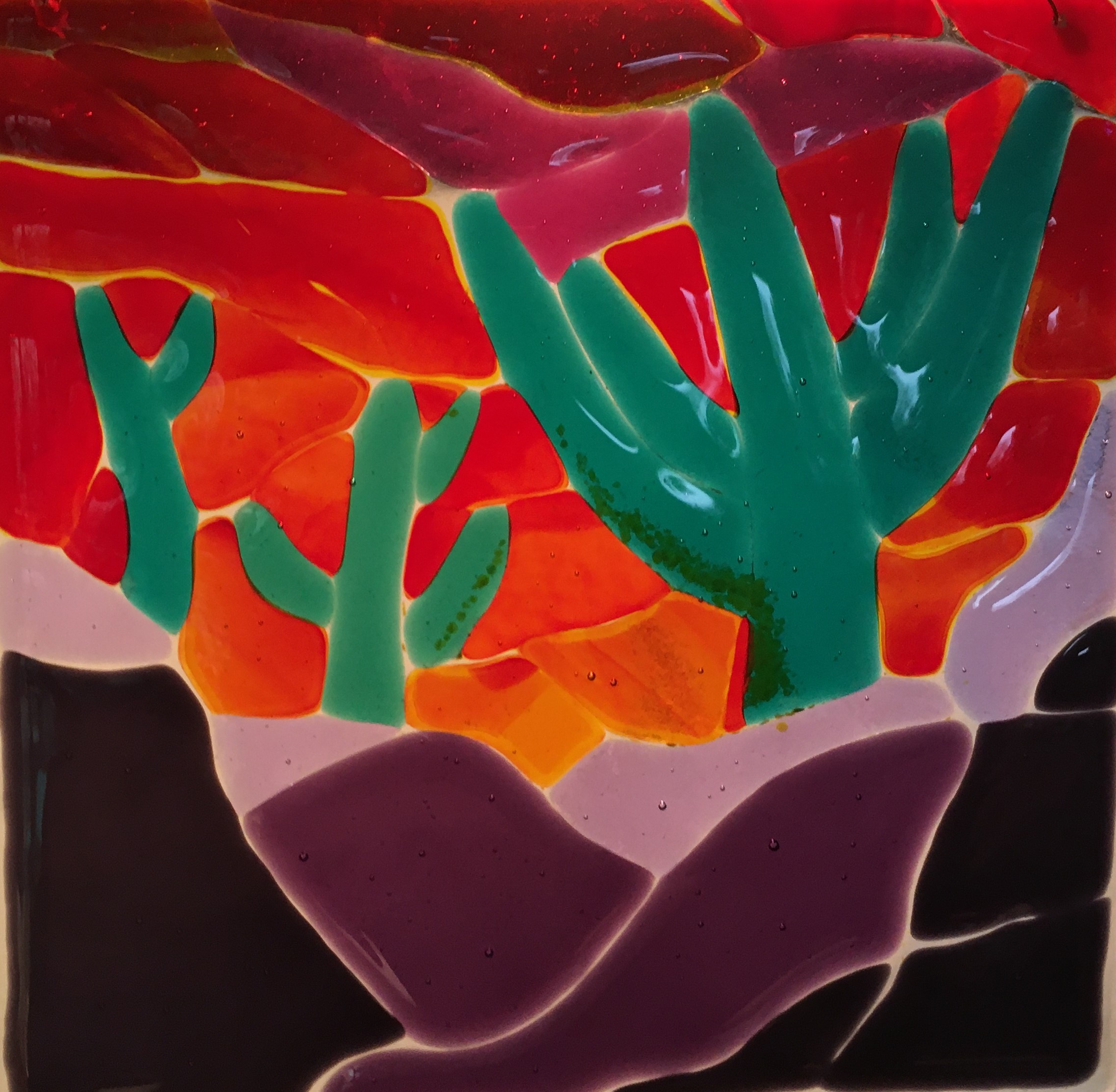 Made from opaque Bullseye glass and powders. Lightly sandblasted to a smooth, matt finish.