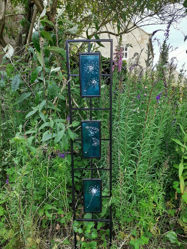 Details: Fused Glass disc mounted on bespoke steel stand.
