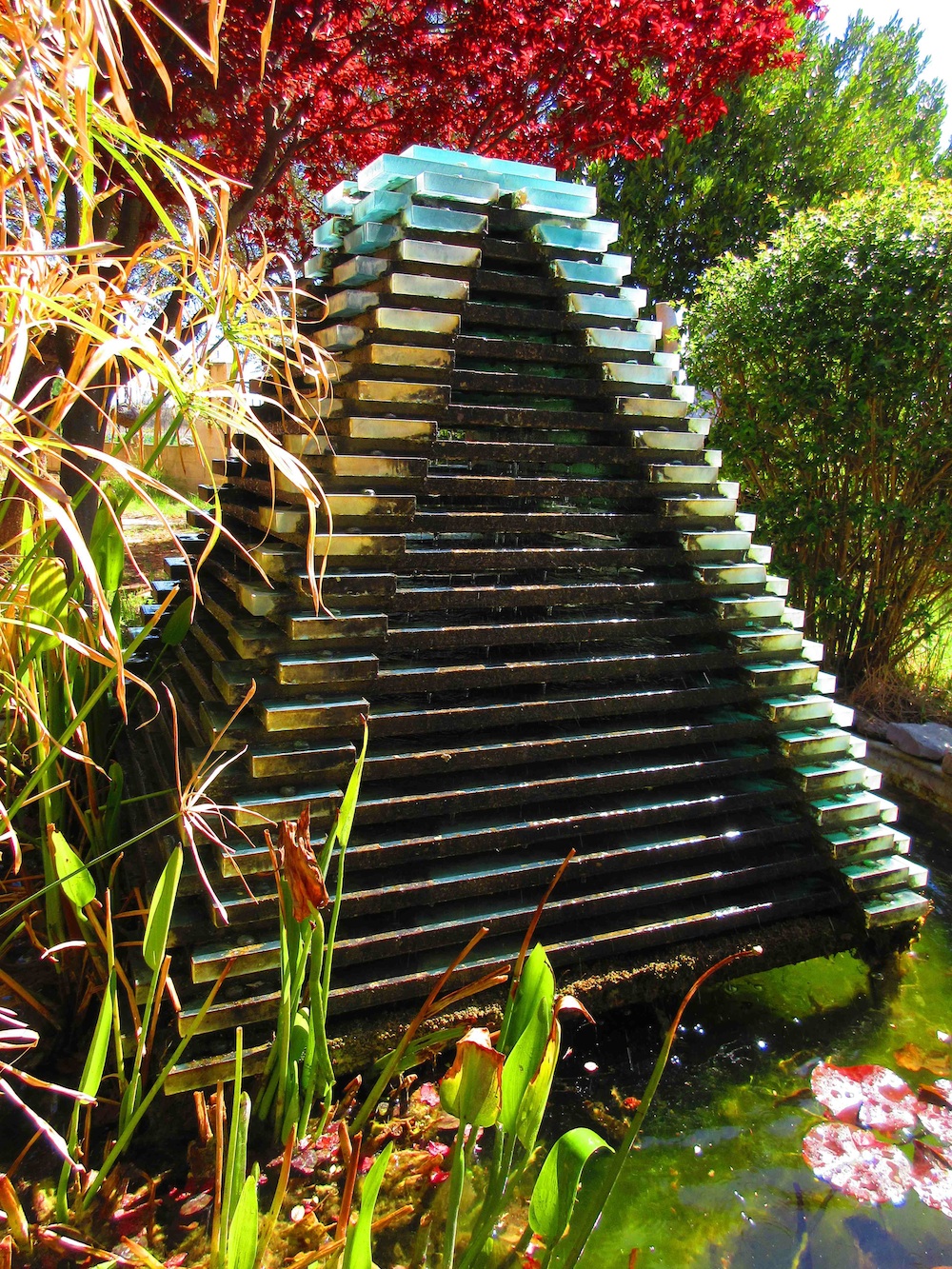 Details: Garden Fountain - 92 pieces of 25 mm clear glass slabs, hand sawn and sandblasted, loosely assembled on a galvanized steel base