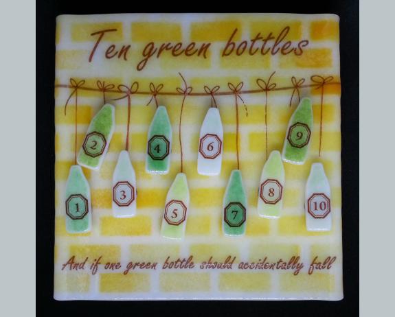 Wall Art : Fun piece of fused glass : "Ten green bottles" is a glass brick wall with removable magnetic bottles
