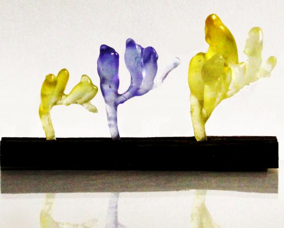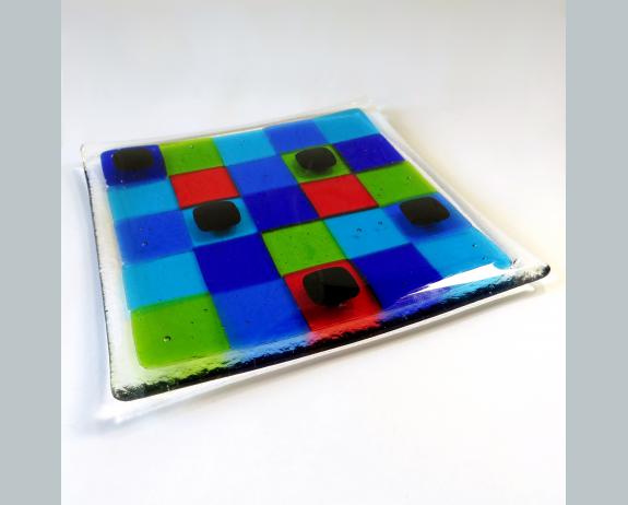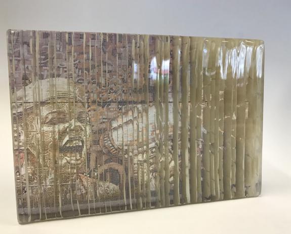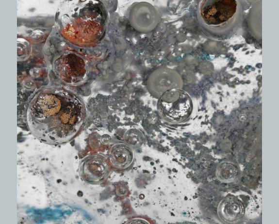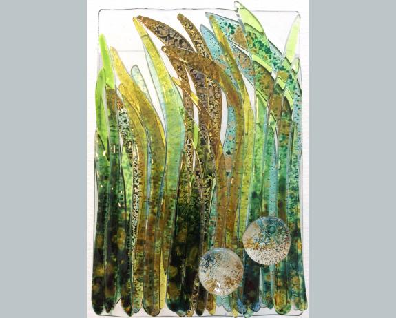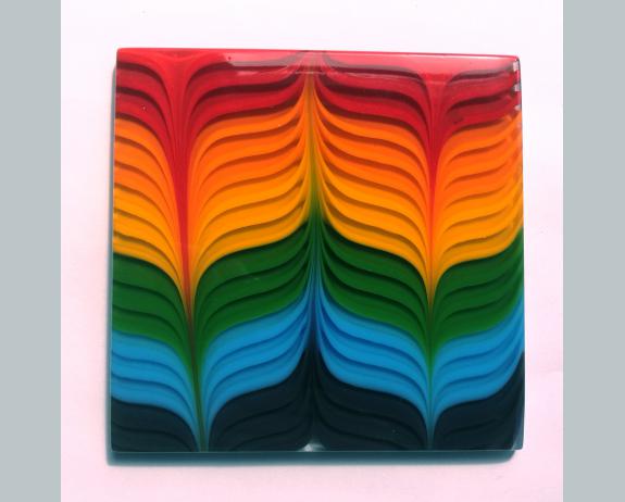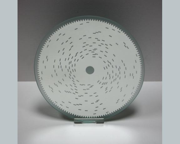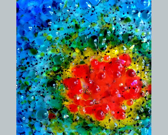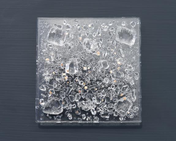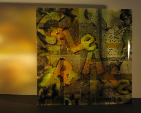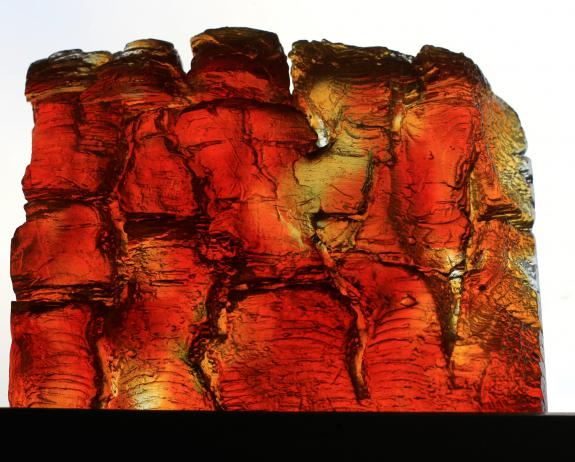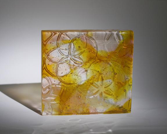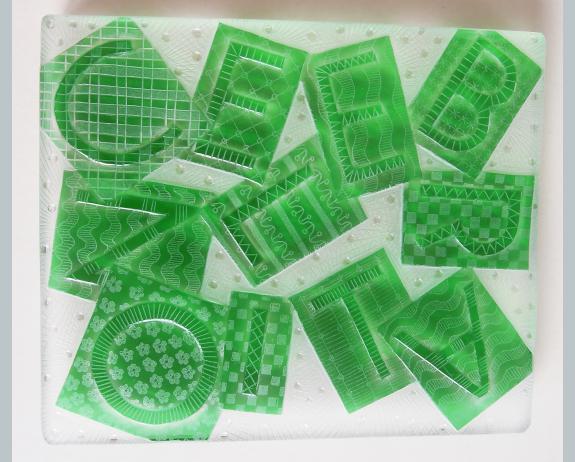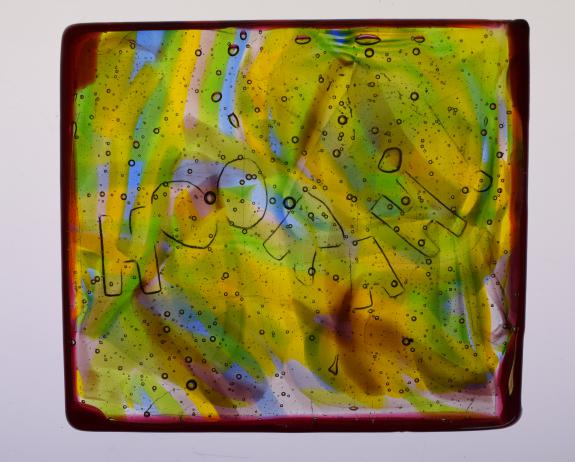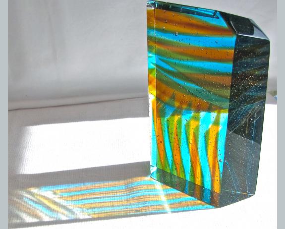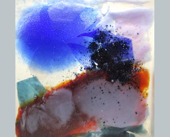 Bullseye glass: powders, shards, blocks; fused, grinded, engraved, polished