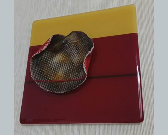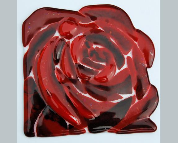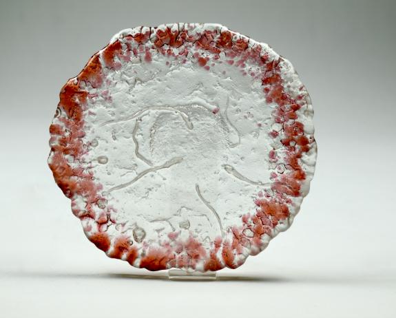 Details: Kiln cast, free formed glass in shades of 'Ruby'