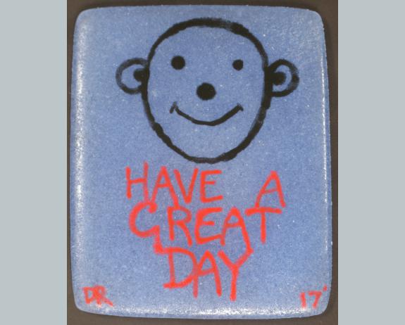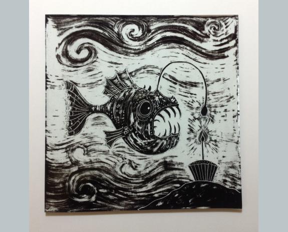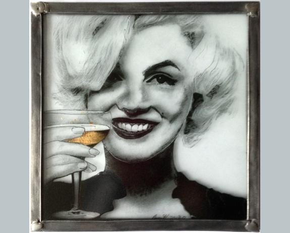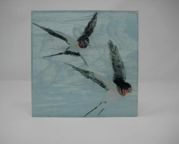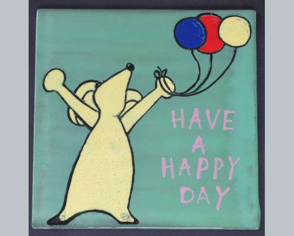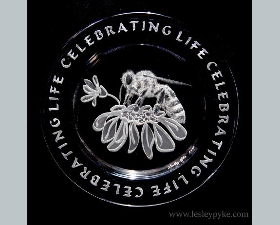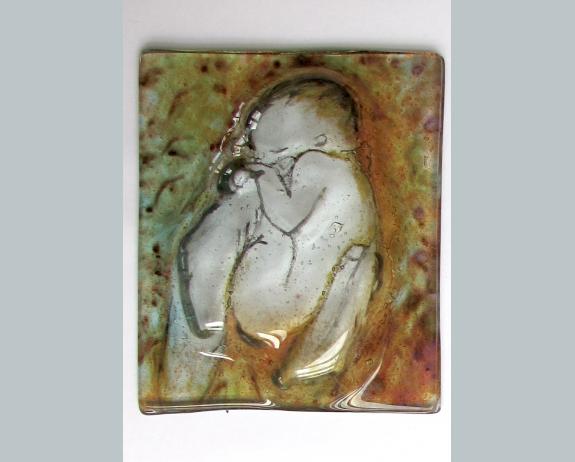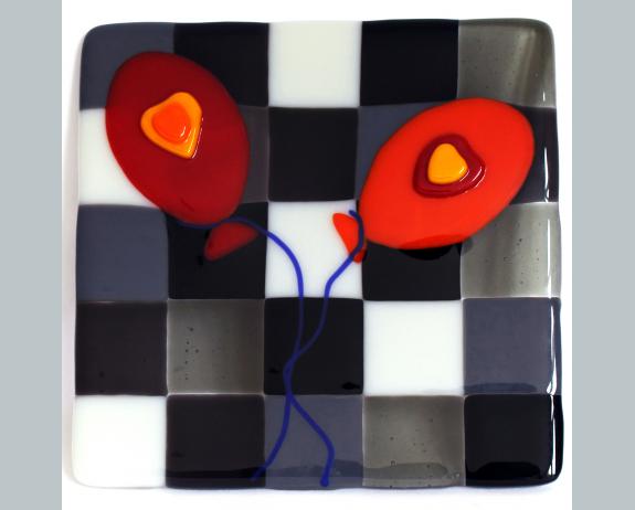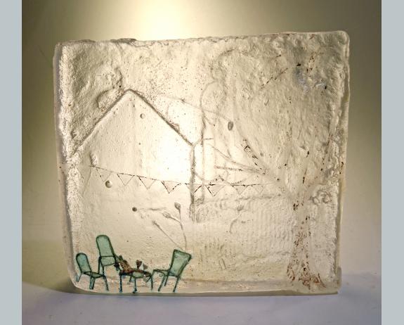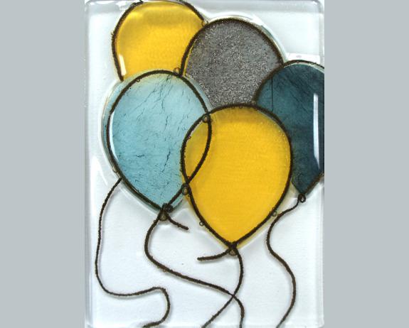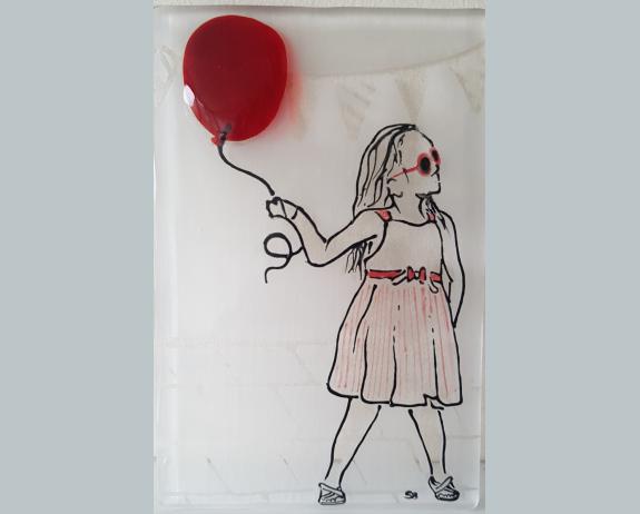 Hand drawn with enamels and sandblasted with fused glass balloon addition.