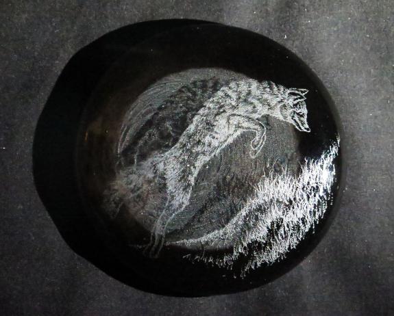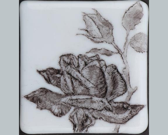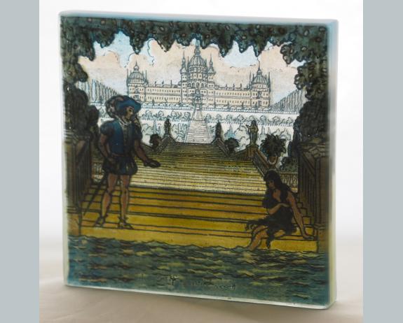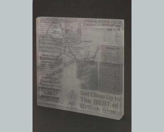 Images sandblasted on rear of glass and piece is laid on black card. Price £100