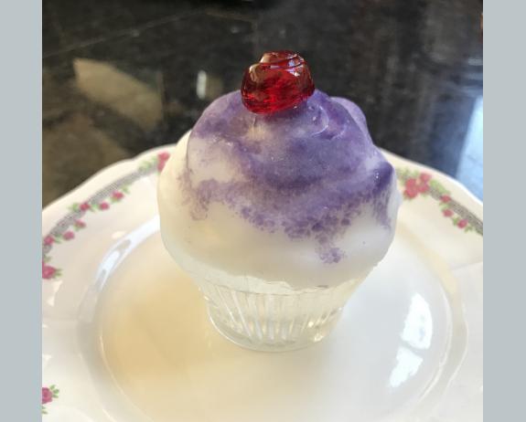 Lost wax cast glass muffin with a flame worked cherry on the top. Cold worked and polished. Bullseye Glass.