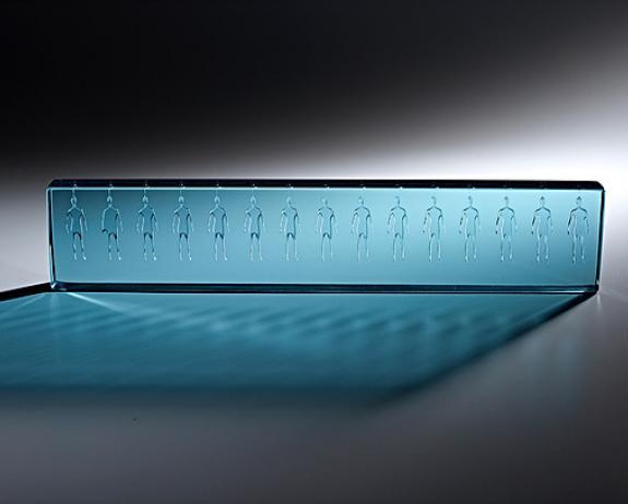 A Motion Capture recording of a dancer's movements was converted to a CAD type file and then printed with rapid prototype printer. The printed model was molded with silicone rubber and a wax positive was poured. After editing the wax positive the piece was kiln-cast using the lost wax casting technique. the resulting glass casting was coldworked and acid etched.
