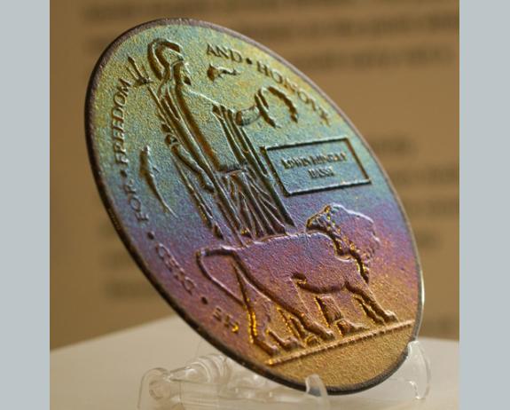 As part of a residency, I was looking at some rare Next of Kin Memorial Plaques - known as 'Death Pennies' - given to families of those who lost their lives as a result of the first World War. The originals were made of bronze and are approximately 15cm diameter and this is an enlarged version of a rare brother and sister pair.