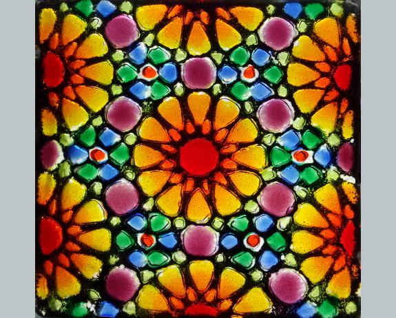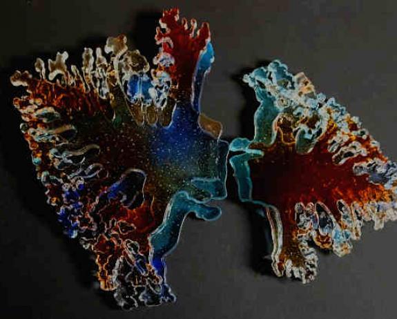 Waterjet fractals cut in previously three layer fused sheet. Fire polished and tack fused.