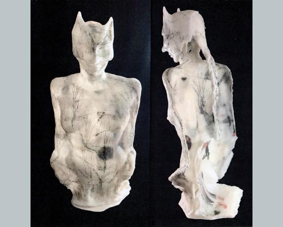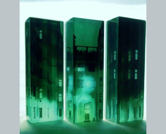 Details: 3 layered Pâte de Verre sculpture, fused digital images ceramic transfer, cm 93 X 43 X 33