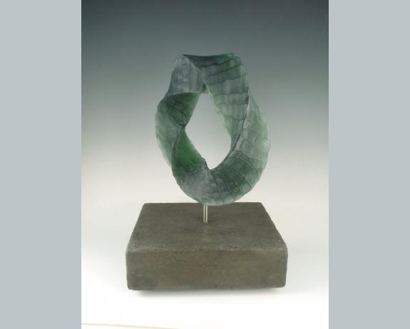 Imagine a triple mobius . . . you must travel 3 times around the object before you return to your starting point. The negative mother mold for this creation was formed using 3-D modeling software and printing. A wax pour created the positive. After the surface was carved, a plaster mold encased the wax form. Steaming removed the wax and then the cold plaster mold and cold glass went into the kiln. Once fired, cooled down and free from the plaster mold, further cold-working finished the surface before the mobius triangle perched on the stainless steel atop a concrete base.