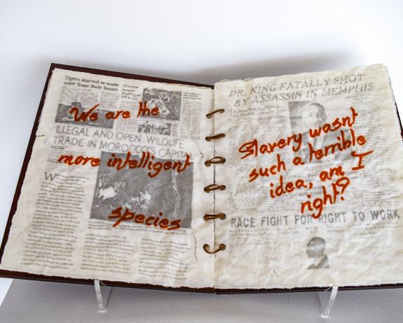 The art piece is a collection of real newspaper articles describing compelling events or facts. Upon the pages are sarcastic inscriptions or “graffiti” ignoring the issues at hand. This was created by Adobe Photoshop, Screen-printing, Laser Cutting the wood and acrylic, and fusing glass.